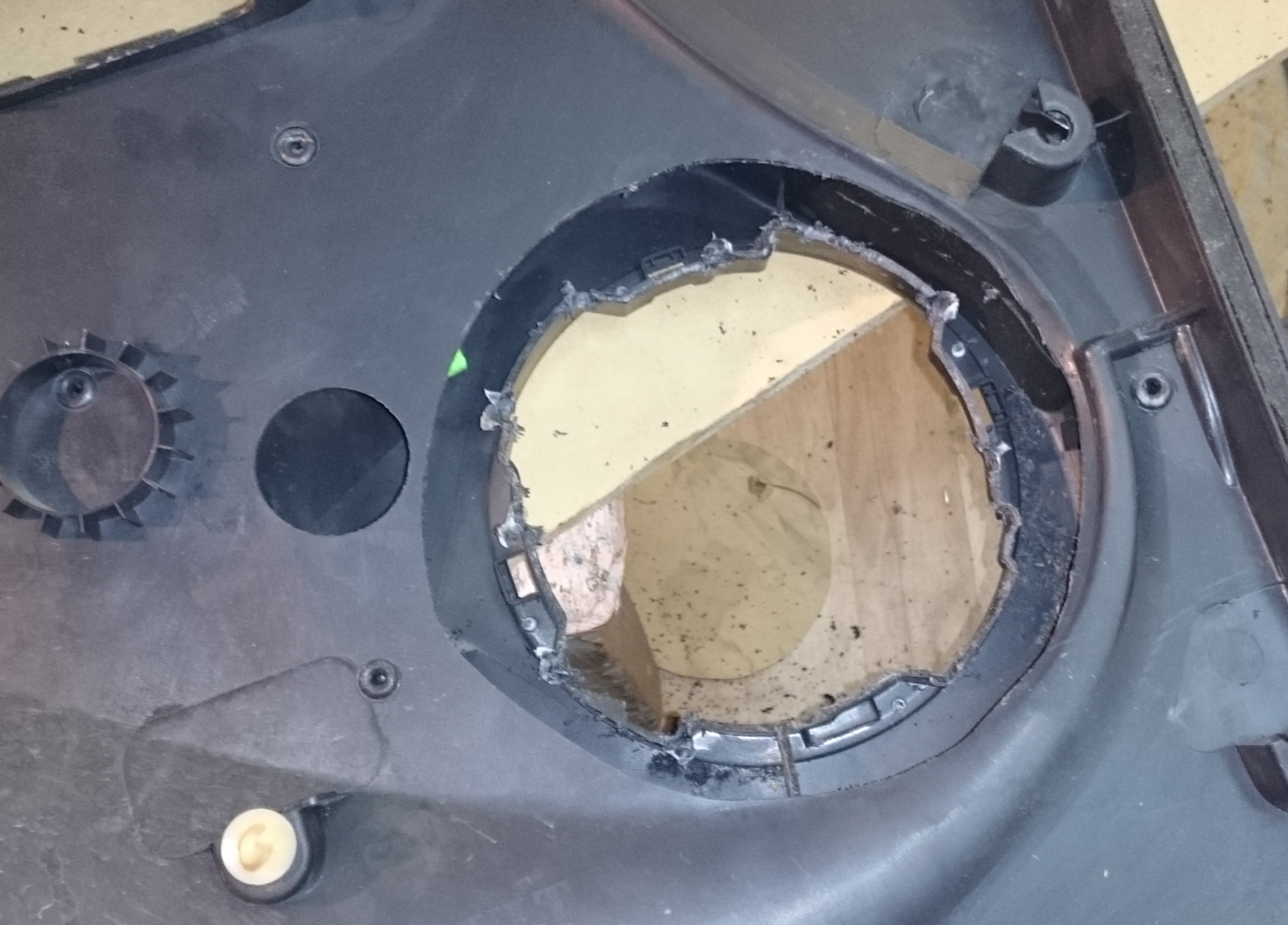 Итак будем устанавливать динамические головки в передние двери по-правильному. Для этого необходимо: - демонтировать динамики; - демонтировать карту двери; - изготовить установочные проставки для динамиков; - вырезать в картах дверей посадочные места под проставки; - установить проставки на внутренний металл дверей; - установить динамики на проставки; - установить карты дверей; - установить штатные сетки динамиков в штатные места. ПРОИЗВОДСТВО РАБОТ