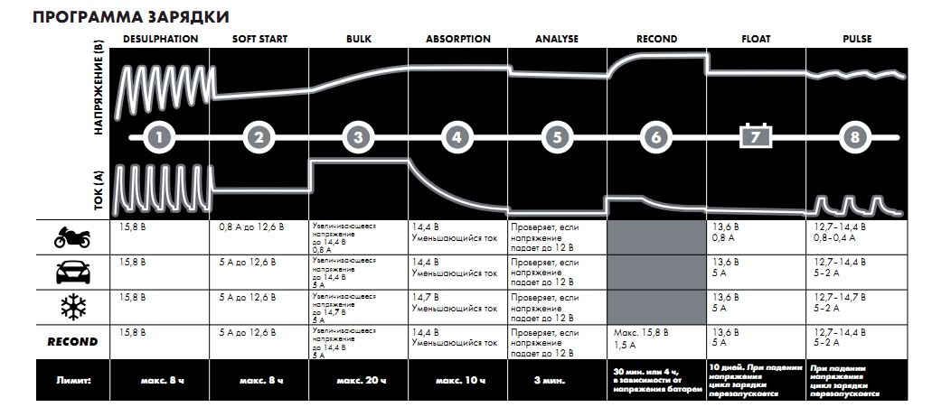 Для начала простой эксперимент для тех, кто сомневается в кипении и вообще в моих словах. Берём обычный Са/Са акк, ставим его на зарядку. Напряжение 14.6В, ток 0.7А. Наблюдаем что происходит. Результат видно на фото (умеренное кипение). Теперь тоже самое при напряжении 15.5В. Видно, что кипение значительно усиливается. ================================================== ================ А теперь о том что случается с акком при таких вот регулярных «подзарядках». По незнанию я дозаряжал его режимами типа 14.8-15.0В и небольшой ток, думая что так и надо. Чтоб не быть голословным – вот фото одной из банок. На фото видно, серый слой «порошка». Порошок – это отвалившиеся намазки (активная масса пластин), которую вынесло в результате «кипячения». Это остатки роскоши, основная масса покоится на дне аккума. ================================================== ================ Теперь что касается зарядки и напряжений. Есть такой небезызвестный шведский производитель зарядных устройств СТЕК. Алгоритм зарядки его устройств по сути CC/CV, расширенный дополнительными режимами. Ниже приведена схема Основная зарядка происходит на 3 и 4 этапах. Сначала зарядка постоянным током до 14.4В, потом зарядка при постоянном напряжении 14.4В уменьшающимся током. Я неоднократно убеждался, что таким образом акк заряжатеся до 100%. После КТЦ новые акки (что Са/Са, что АГМ) отдают фактически всю свою паспортную ёмкость. Недаром зарядка по CC/CV сертифицирована и используется в таких автоматических зарядных устройствах как СТЕК, Bosch, EXIDE и др. Но сейчас нас интересует вынесенный отдельно режим Recond (зарядка при напряжении до15.8В и токе до 1.5А). Второе название этого режима – «контролируемое газовыделение». Режим служит для перемешивания электролита и выравнивания плотности по всей высоте банки. Работает так: зарядка поднимает напряжение до макс 15.8В, электролит начинает «кипеть». Поднимающиеся пузырьки перемешивают нижние слои с верхними. А теперь самое важное. Что СТЕК пишет об использовании этого режима: «Используйте программу Recond не чаще одного раза в год или после глубокого разряда батареи. Внимание! Частое использование программы Recond может привести к потере воды в батарее и укоротить срок службы». Шведы как бы намекают, что этот режим должен использоваться в исключительных случаях, а не для повседневной зарядки. А у нас к вопросу подходят со всей душой и предлагают постоянно заряжать (читай кипятить) при напряжении 16.5В. =================== Выводы я делать не буду, а то меня опять обвинят в ереси. Пускай каждый решает сам как быть. Могу только сказать - если нет желания разбираться во всех тонкостях, купите автоматическую зарядку. По крайней мере так риск сделать гадость самому себе будет намного меньше. ================================================== ========= По поводу генератора. Я не знаю какие из генераторов подходят под определение «современных», но генератор моего Дастера при старте выдаёт положенные 14.4В, а когда акк зарядился, напряжение начинает опускаться (при долгой зарядке вплоть до 13.8В). Фото слева – сруз после старта, справа – после 1.5км езды. Увеличение значения 14.4 (+0.3…0.4В) я допускаю в случаях термокомпенсации. Напряжение при старте - вообще ниочём. Главное какое напряжение будет поддерживаться по мере зарядки и когда аккум будет заряжен. Если при заряженном аккуме генератор будет шпилить и дальше 14.8-15.0В, тогда см. выше что происходит. Последний раз редактирова