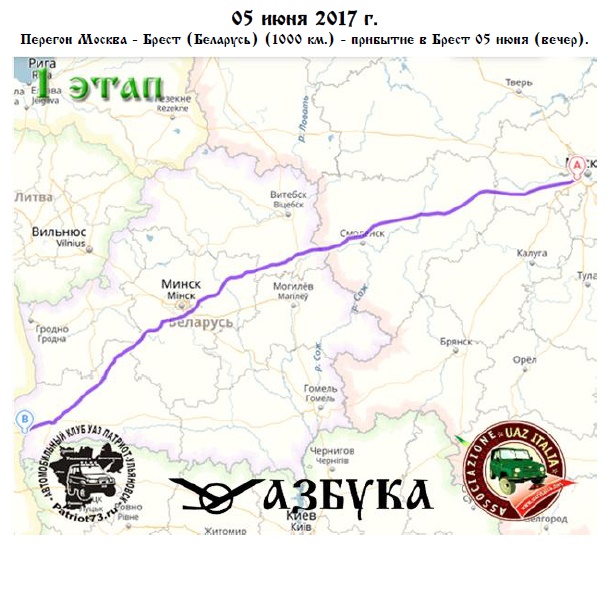 Перегон Москва - Брест (Беларусь) (1000 км.) - прибытие в Брест 05 июня (вечер). Ночёвка (1 ночь) - бронь на всю команду (на данный момент 9 человек) - 3000 руб. (за 1 ночь).