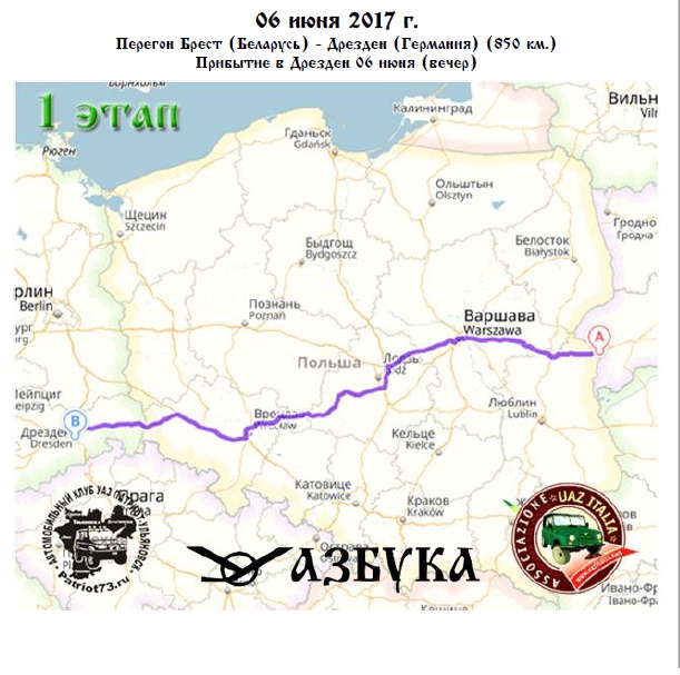 Перегон Брест (Беларусь) - Дрезден (Германия) (850 км.) - прибытие в Дрезден 06 июня (вечер) - [url=https://yandex.ru/maps/?rtext=52.072851%2C23.655803~51.081398%2C13.691468 &rtt=auto&ll=18.671111%2C51.630148&z=7&mode=routes &rtm=atm]маршрут[url/]