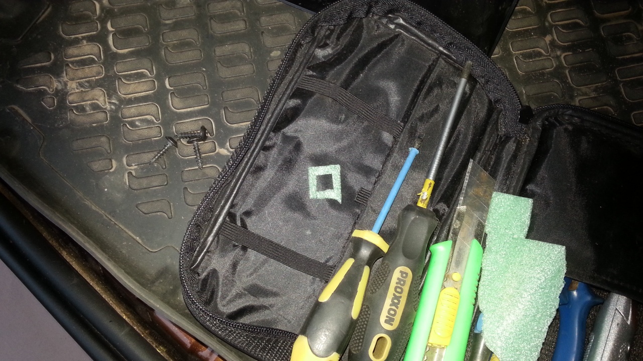 Ранее, во время поиска "сверчка", был снят стопарь с задней двери. Стало тихо. Вернул его назад, подложив под крепеж квадратики, вырезанные из строительного утеплителя. Кажется из изоплена.