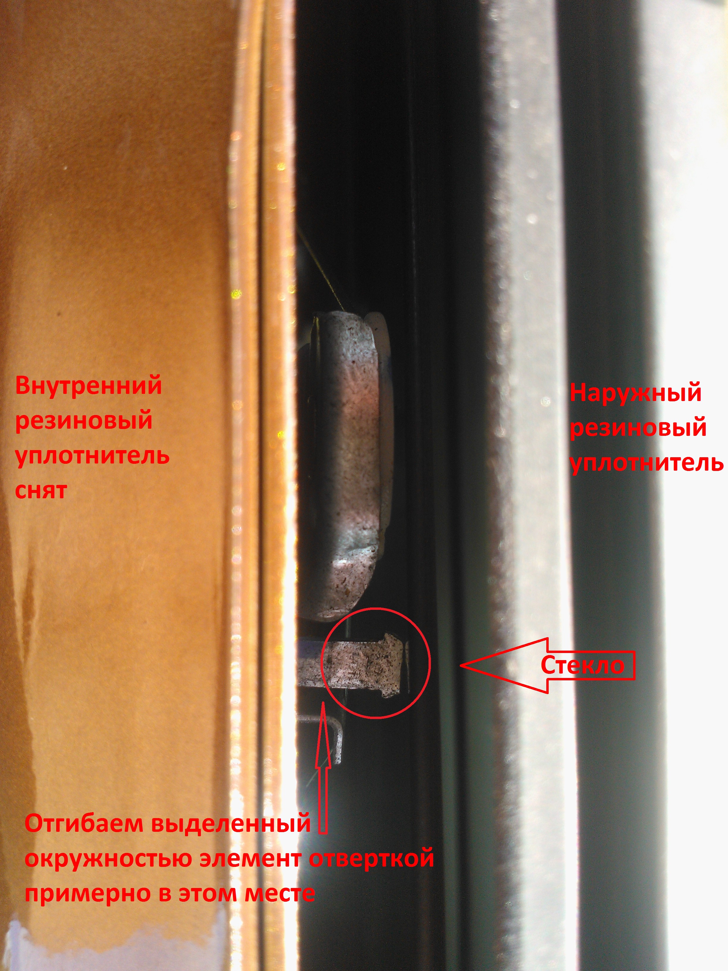 Выкладываю без редактирования. С последующим добавлением в первый пост. С какого-то момента начало скрипеть/свистеть стекло только при подъеме, в самом начале подъема. При этом не было явно понятно, стекло это или механизм эл.стеклоподъемника, никаких явных следов на стекле не было. Занялся шумоизоляцией дверей и опытным путем обнаружил причину. Сначала чистил направляющие бархатки, смазывал направляющую подъемника, но не помогало. Причина оказалась проста, видно из фото. После первого отгибания металлического ограничительного элемента внутри дверцы, стекло стало скрипеть наоборот только при опускании. В общем подгибая этот ограничитель, полностью избавился от неприятного скрипа стекла при поднятии/опускании
