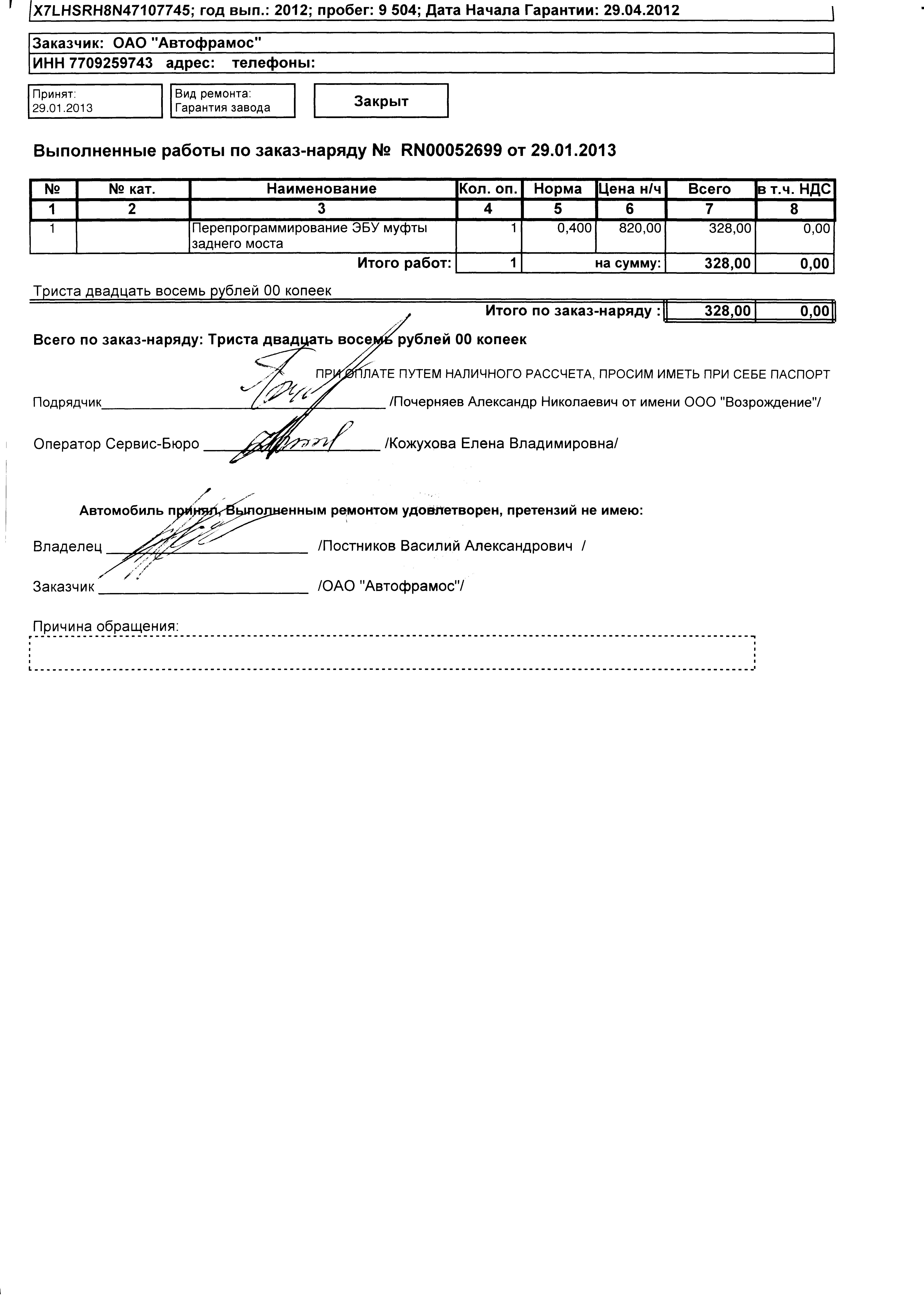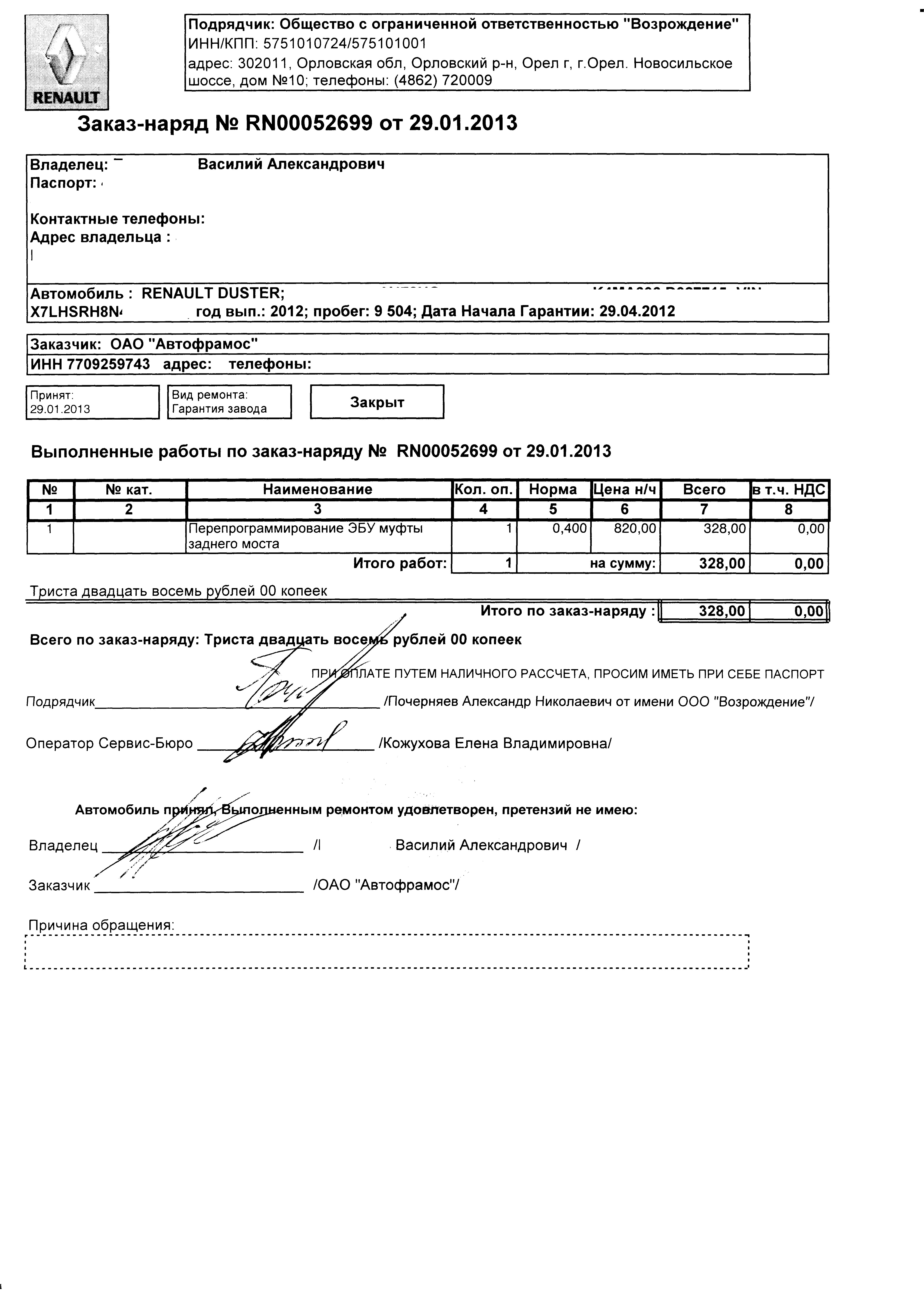 Сегодня утром ездил в РТДС на Обручева - прошивал муфту. Приехал на 10 минут раньше и к означенному времени уже машину сдал и курил бамбук. Рассчитывал уложиться от силы в час, но не вышло Отдали машину через 2.5 часа Хотя что и как именно они делали я не знаю, но по заказ-наряду всего 0.8 нормо-часа. В книжке никаких печатей и отметок не делали. Только вот такая бумажка осталась. Ждем выходных, снега и сугробов для проверки