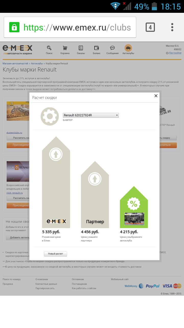 Воспользуйтесь специальной партнерской программой компании EMEX, вступив в один или несколько автоклубов, и получите скидку 21% от розничной цены EMEX*. Cкидка варьируется в зависимости от специализации автоклуба («клуб по марке» или универсальный)**. В некоторых случаях при получении заказа в точке выдачи может потребоваться доплата за доставку***.