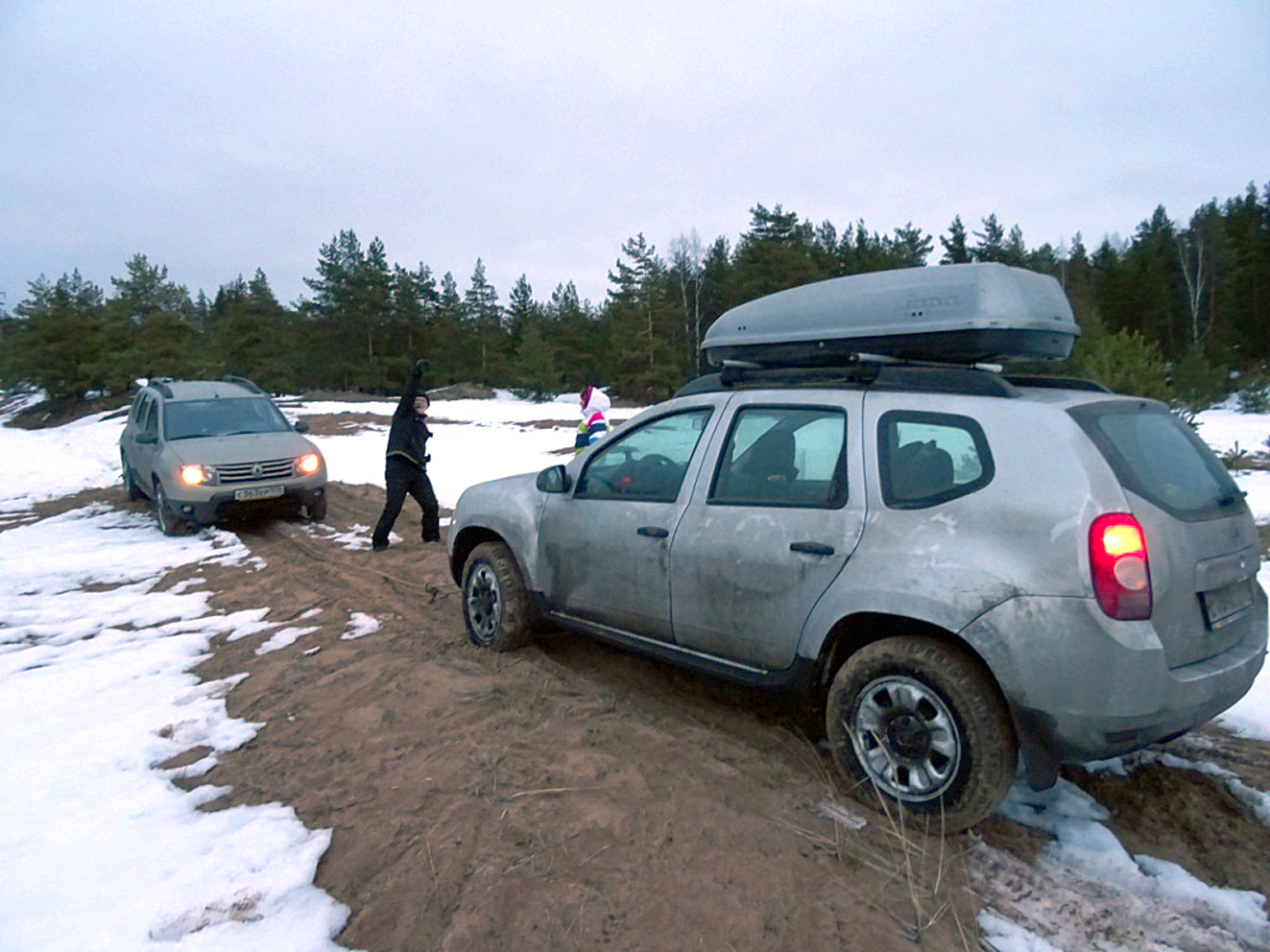 Какой смысл уповать на лучшее - погода есть погода. Она была питерская, серенькая, маловетренная. Ну, это все и сами знают. Я то пишу об этом потому, что летняя погода в Желтой значительно отличается от Питера, как правило, и если здесь льет, то не факт, что в Желтой солнца нет тоже. Приехали, поставили палаточный тент, в него газовый обогреватель. И совершенно не напрасно, ибо когда мы ненадолго уехали посмотреть Танковую дорогу, то Алла, жена Игоря, три часа ждала нас спокойно, не дрожа от холода. Потрапезничав чем бог послал, а Игорь почему-то не прислал фото самого главного - куриных грудок в соусе, великолепно пожаренных Аллой на мангале, мы решили съездить на другой конец бухты посмотреть на предполагаемое место покатушек, оставив при этом хозяйку на хозяйстве. Дорога на берег набита и проезжаема без проблем, но мы решили сразу повернуть на холмик по Танковой дороге (туда раньше заезжали с полигона взвода на марше). Машинку потаскивало маленько из стороны в сторону, но мы в общем нормально на нее поднялись. Ну а сверху то катиться проще. Правда в самом низу повыбивали дорогу покатушники на 2-3 раза по двадцати одному сантиметру - по-колено. Одетые манжеты работали гораздо лучше стоящей рядом с машиной лопаты в крупенистом насыщенном влагой снегу - на пузе по всему телу. Игорь, как человек рассудительный наблюдал за всем этим с высоты птичьего полета - вершины горки, потом развернулся и поехал вокруг нее, дабы подобраться ко мне с другой стороны для буксировки, но с таким же успехом зарылся в коварном снегу между небольшими холмиками-барханами. Там уже не до фотографий было. Ну сколько нужно времени для того чтобы вывесить домкратом восемь-десять колес, дважды вычистить под брюхом машины снег, обследовать окрестности на предмет поиска заменителей сэндтраков? Думаю пару часов, и еще меня ковыряли, а бедная Алла одна в лесу, благо в обогреваемой палатке - а поначалу скептицировали по поводу этой приблуды! Выкатился Игорь. Сели в машину, поехали, собрали лагерь, вернулись и тридцать метров тащили меня на брюхе. Вот так мы провели этим днем! Последний раз редактировалось valex; 09.03.2015 в 03:22. |