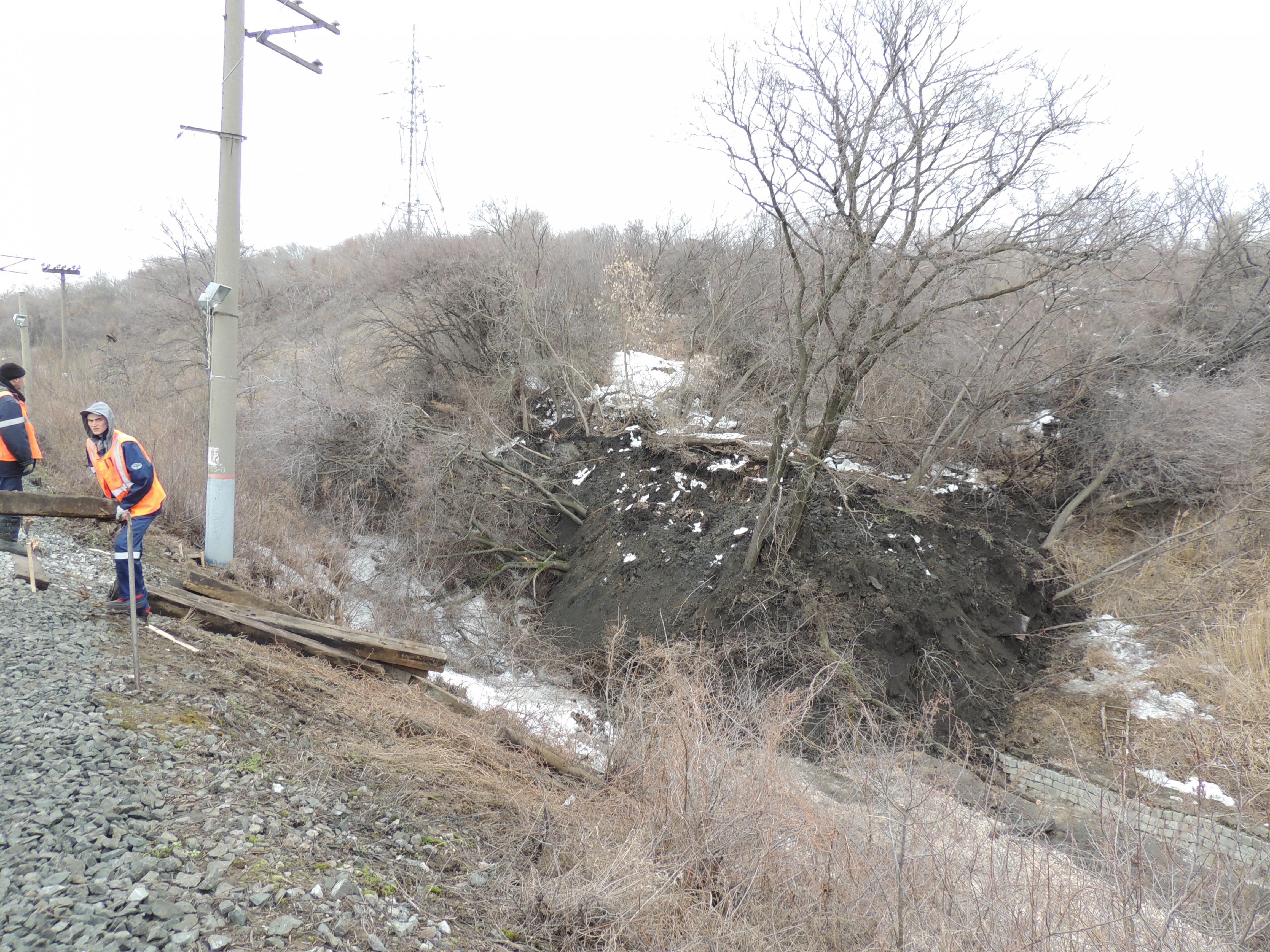 Две утренние фотки и одна вчерашняя вечерняя. Железнодорожники успели вчера сделать крышу из шпал между водовыпуском коллектора и трубой под ж.д. дорогой. К утру оползень подполз к подошве насыпи железной дороги.