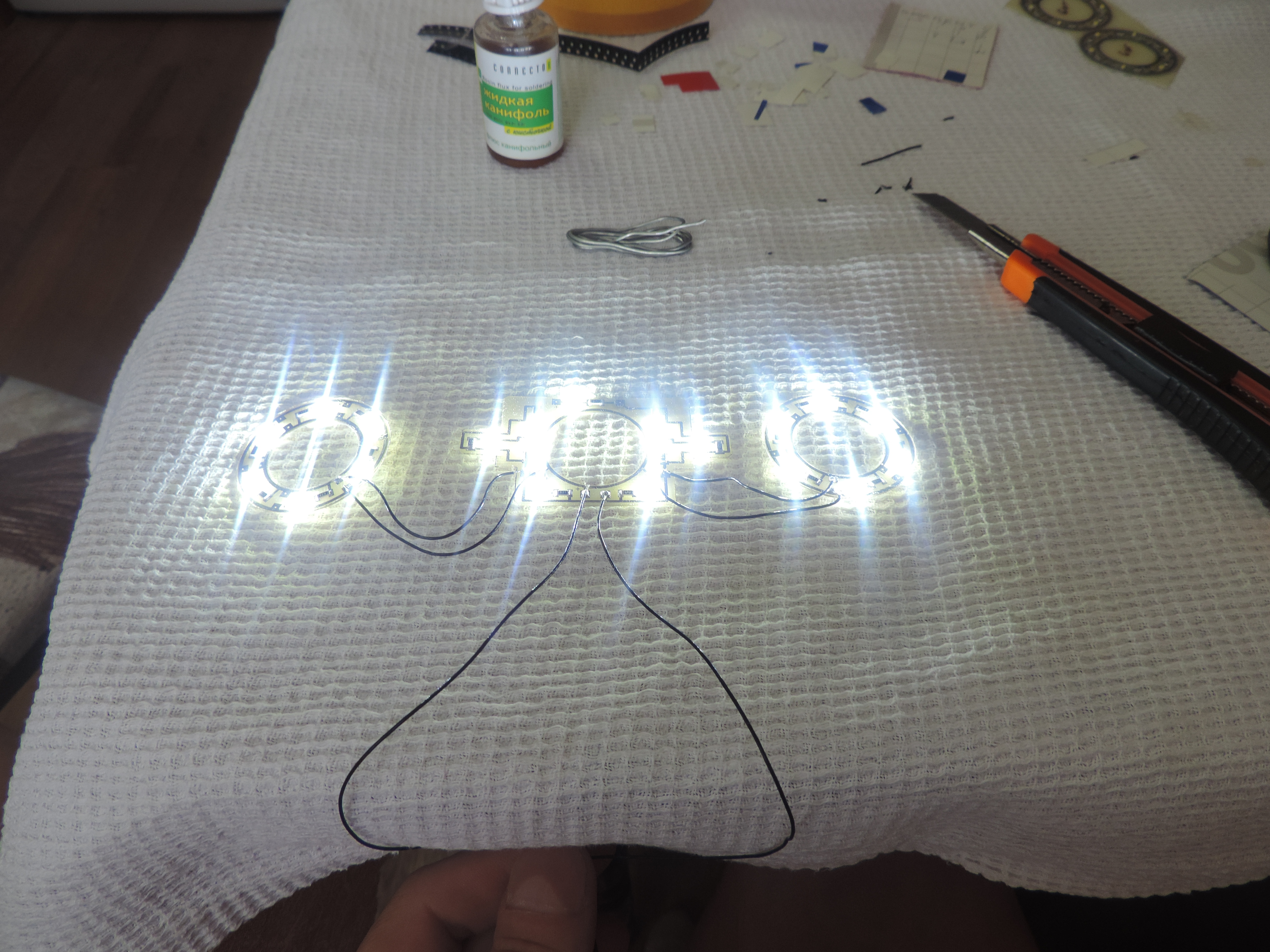 Сегодня появилась идея, сейчас на работе собрал макетницу из трех светодиодов, трех резисторов и одного обычного диода....