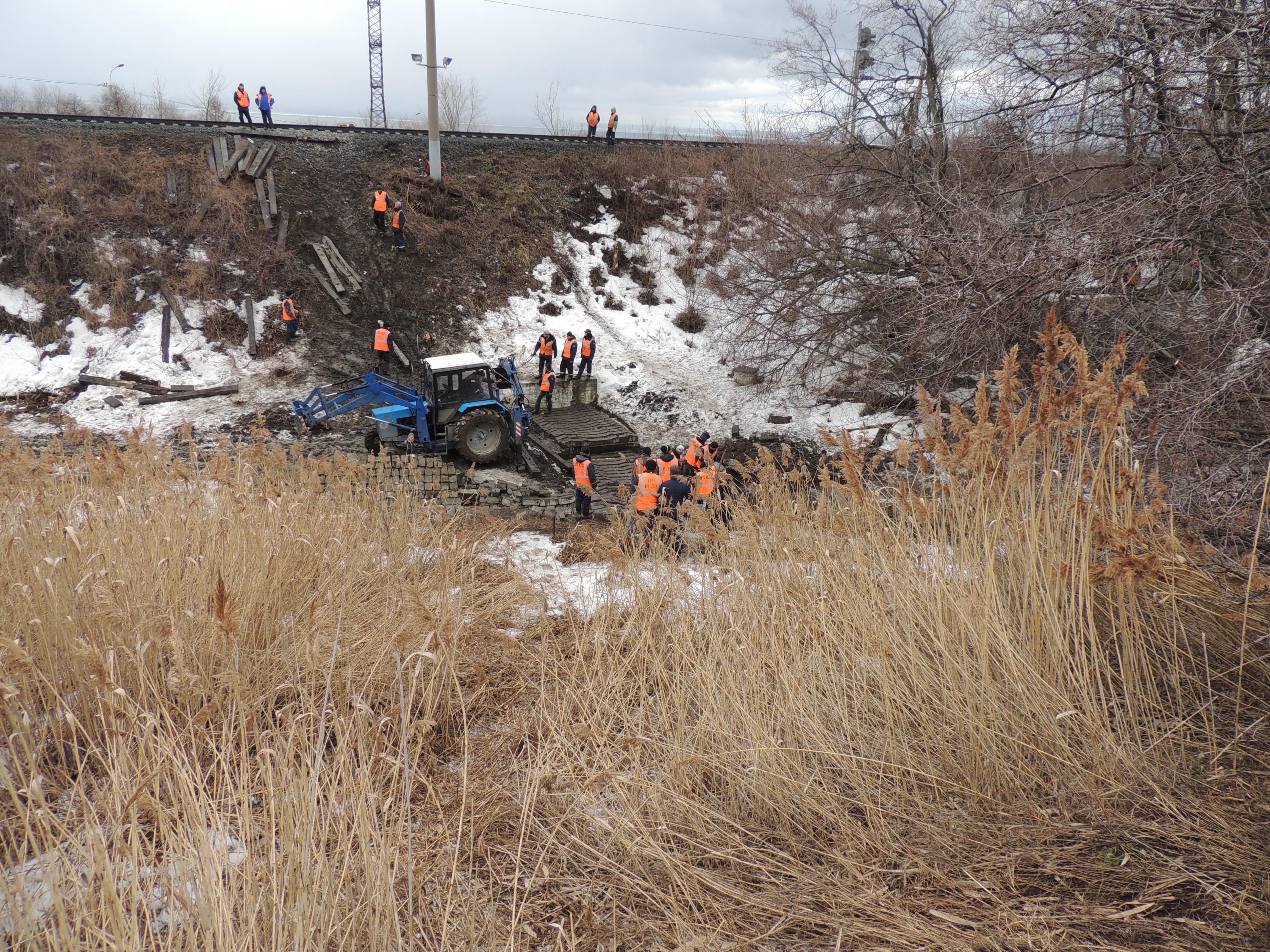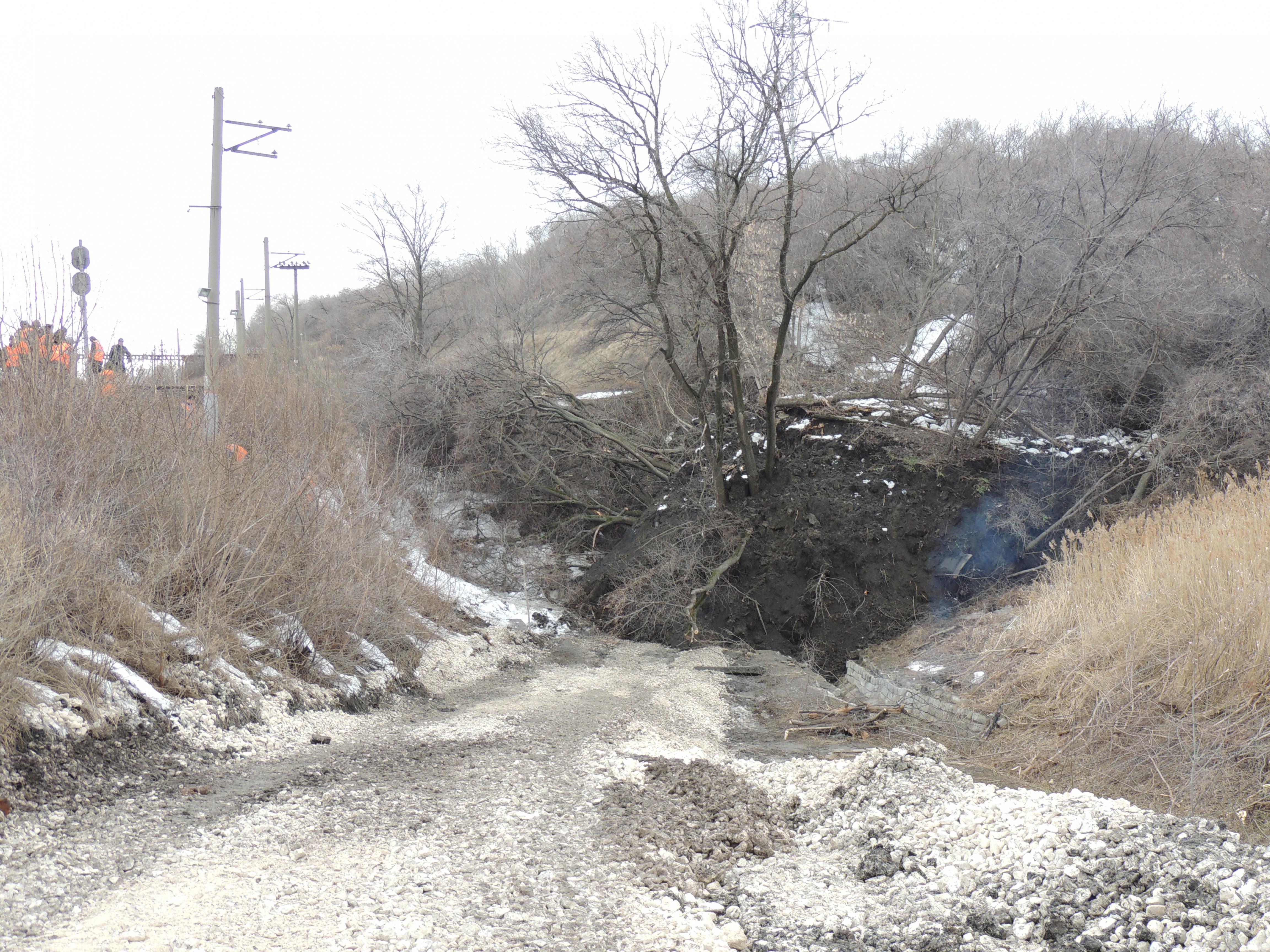 Две утренние фотки и одна вчерашняя вечерняя. Железнодорожники успели вчера сделать крышу из шпал между водовыпуском коллектора и трубой под ж.д. дорогой. К утру оползень подполз к подошве насыпи железной дороги.