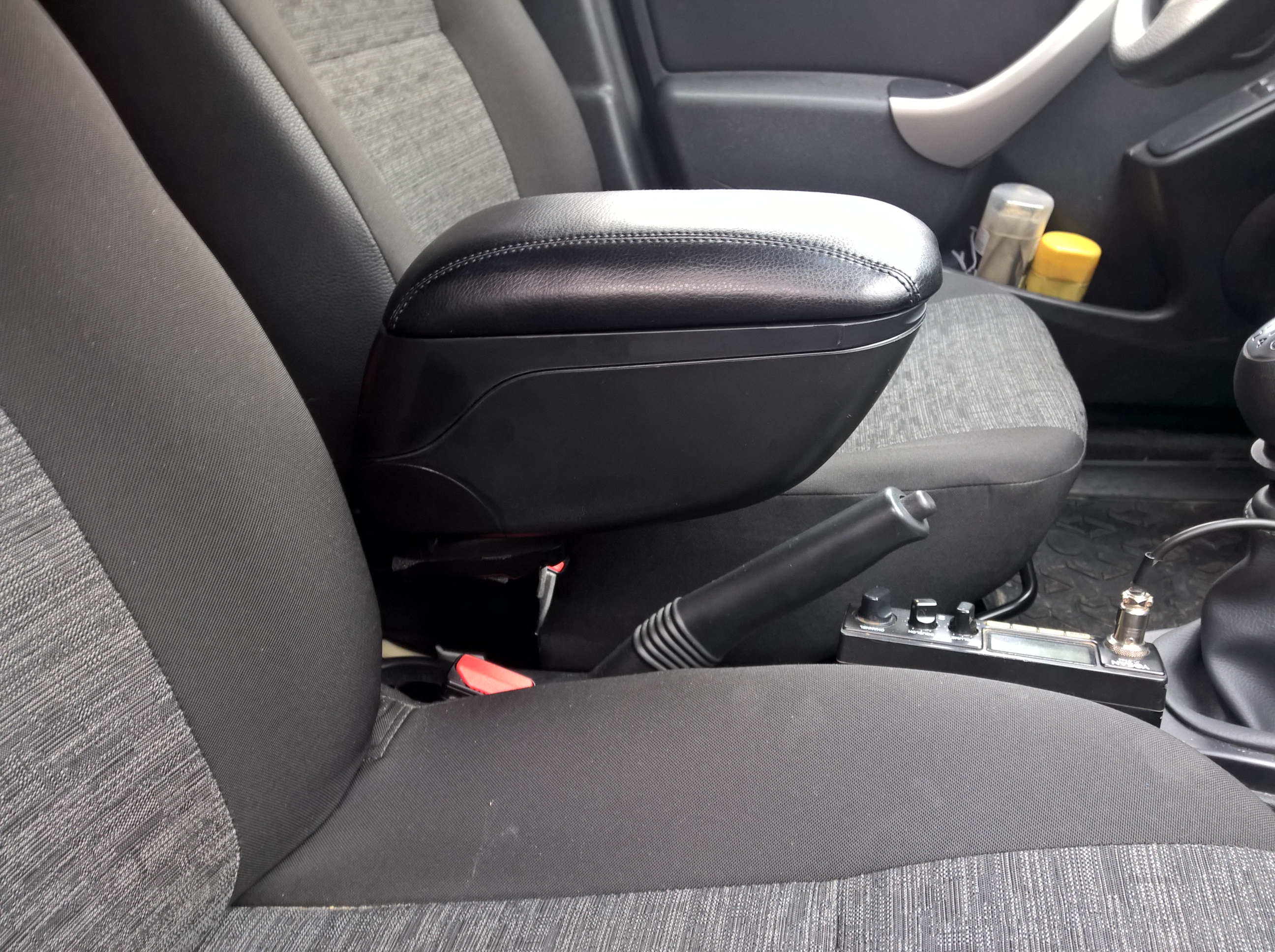 из-за того, что он был от комплектации с регулировкой высоты сиденья, решился на приобретения подлокотка от лада Ларгус по совету нашего одноклубника Синий Дипломат. И так заказал подлокотник в магазине Largus-shop Подлокотник был заказан с кронштейном «Железная нога» для более надежного крепежа. На сайте я нашел информацию о том что кронштейн переделан для крепежа на пассажирской стороне для более удобного доступа водителя к ремню безопасности. Примерив кронштейн подлокотника и с водительской и с пассажирской стороны для себя сделал выбор установки именно на водительскую сторону по нескольким причинам: 1. Пассажирское сиденье постоянно регулируется по месту установки и кронштейн будет царапать ручку регулировки наклона спинки, а водитель тобишь я, делаю это крайне редко. 2. При установке на водительскую сторону в подстаканник легко входит 1,5 литровая бутылка воды. 3. Подлокотник дает нормальный доступ к ручнику и КПП. Так как кронштейн был изменен пришлось сделать дополнительное отверстие для винта крепления салазок сиденья. Все места соприкосновения кронштейна с пластиком и сиденьем обклеены шумозащитными материалами. Собственно после установки имеем отличный подлокотник.