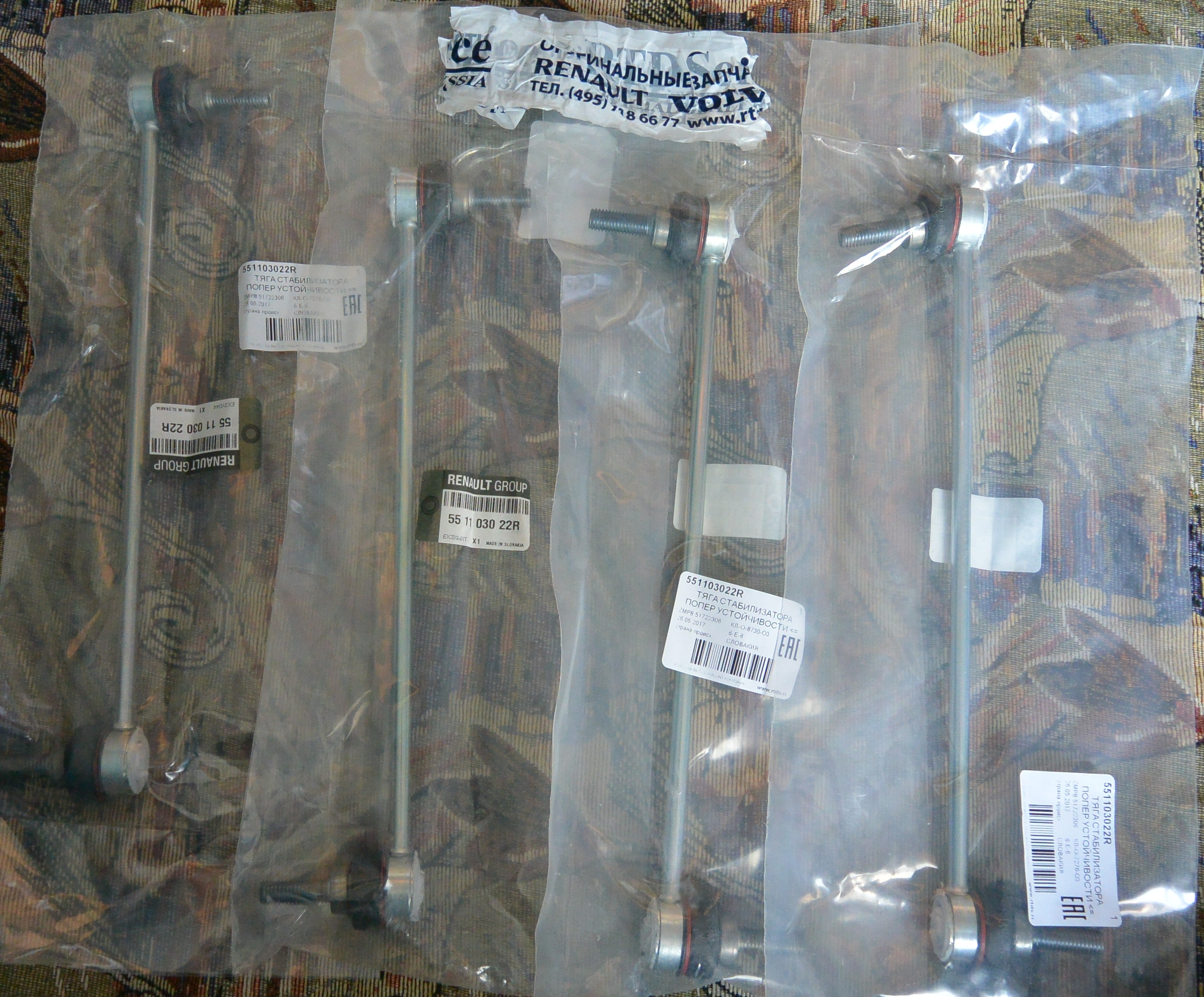 Купил 4 оригинальные стойки стабилизатора Renault 551103022R по 1078р. (4312р. за 4 стойки) в isnext ! Каждая стойка в отдельном запечатанном пакете с двумя наклейками: Renault Group и штрихкодом от rtds.ru, все 4 пакета были замотаны фирменным скотчем RTDService .