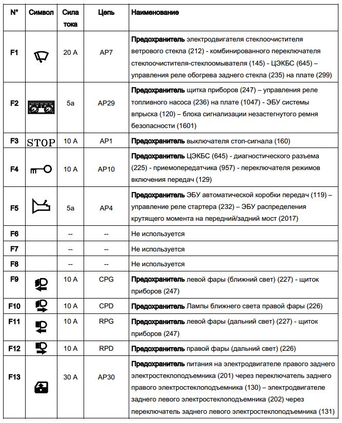 F1 60А - Предохранитель замка зажигания (104) - переключателя наружного освещения (209) F2 - 15А - Предохранитель в модификации с кондиционером, питания муфты кондиционера (171) через реле муфты кондиционера (474) на плате (784) или 30А - Предохранитель в стандартной модификации с отопителем питания электровентилятора системы охлаждения (188) через малой скорости электровентилятора системы охлаждения двигателя (700) на плате реле (784) F3 25А - Предохранитель управления и питания реле блокировки системы впрыска (238) на плате реле (1047) - питания реле топливного насоса (236) на плате реле (1047) F4 - Не используется ![]() F5 15А - Предохранитель ЭБУ автоматической коробки передач (119) F6 60А - Предохранитель цепи питания переключателя наружного освещения (209) - блока предохранителей в салоне (1016) F7 40А - Предохранитель в модификации с кондиционером питания электровентилятора системы охлаждения (262) через реле высокой скорости электровентилятора системы охлаждения (336) или через реле малой скорости электровентилятора системы охлаждения (700) на плате реле (784) и резистора электровентилятора кондиционера (321) F8 25А - Предохранитель ЭБУ АБС (118) на модификации без ESP - ЭБУ АБС и ESP (1094) на модификации с ESP F9 50А - Предохранитель ЭБУ АБС (118) на модификации без ESP - ЭБУ АБС и ESP (1094) на модификации с ESP K1 40A - Реле электровентилятора подачи холодного воздуха (233) K2 40A - Реле высокой скорости электровентилятора (336) K3 20A - Реле малой скорости электровентилятора (700) K4 20A - Реле включения кондиционера (474) K5 20A - Реле топливного насоса (236) K6 20A - Реле блокировки впрыска топлива (238) K7 - НЕ используется. ps Есть нестыковочка у Дачии и Рено по подкапотному ком. блоку...