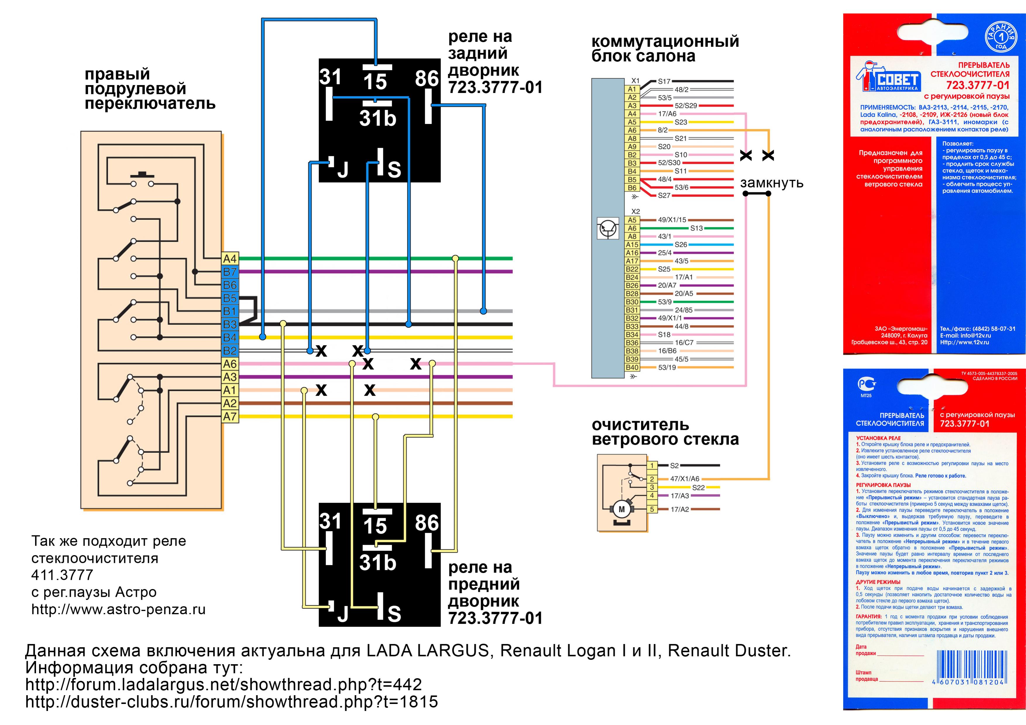 Реле ценой по 190р. за штуку. Сайт производителя реле Я покупал в Москве в Южном порту Компания ООО "Авто-электро ДИАЛ" http://www.dialuch.ru тел/факс +7 (495) 710 31 56 +7 (495) 710 31 57 +7 (495) 710 31 58 Магазины. Адрес магазина: 115432, г. Москва, Авторынок «Южный порт», Магазин № 5 (находится у главного входа на aвторынок) Тел./Факс: +7 (495)287-42-40 E-mail: dialuch5@mail.ru Условия доставки товаров уточняйте у продавца. График работы магазина: ежедневно 8:00 - 19:00 без перерыва на обед Вот тут, по 190р за штуку. это одна организация, но позвонил по верхним телефонам,сказали нету, позвоните по нижним (по этому номеру +7 (495) 958-90-27) там и забирал г. Москва, ул. Трофимова, д.32, к.1. Оптово-Розничный Торговый Центр (ОРТЦ) Оптово-Розничный Торговый Центр (ОРТЦ) занимается розничной торговлей и средним оптом. Представляет широкий ассортимент товара разных производителей для грузовых и легковых автомобилей. Принимается любая форма оплаты. Осуществляется доставка по Москве и регионам. Адрес магазина: г. Москва, ул. Трофимова, д.32, к.1 Тел./Факс: +7 (495) 958-90-27, 958-90-89, 958-90-69 E-mail: ortc-dial@yandex.ru, lamp2@rol.ru График работы ОРТЦ: Будни 8:00 - 19:00 без перерыва на обед, Выходные и праздничные дни 9.00 - 18.00 без перерыва на обед РЕГУЛИРОВКА ПАУЗЫ 1. Установите переключатель режимов стеклоочистителя в положе¬ние «Прерывистый режим» - установится стандартная пауза ра¬боты стеклоочистителя (примерно 5 секунд между взмахами щеток). 2. Для изменения паузы переведите переключатель в положение «Выключено» и, выдержав требуемую паузу, переведите в положение «Прерывистый режим». Установится новое значение паузы. Диапазон изменения паузы от 0,5 до 45 секунд. 3. Паузу можно изменить и другим способом: перевести переклю¬чатель в положение «Непрерывный режим» и в течение первого взмаха щеток обратно в положение «Прерывистый режим». Значение паузы будет равно интервалу времени от последнего взмаха щеток до момента переключения переключателя режимов в положение «Непрерывный режим». Паузу можно изменить в любое время, повторив пункт 2 или 3. ДРУГИЕ РЕЖИМЫ 1. Ход щеток при подаче воды начинается с задержкой в 0,5 секунды (позволяет накопить достаточное количество воды на лобовом стекле до первого взмаха щеток). 2. После подачи воды щетки делают три взмаха.(заметил что, если поливать долго.... то 5 взмахов) При установке на задний дворник (Ларгус,Дастер) штатная пауза появляющаяся после установки реле(изначально в родном варианте её нет) получается примерно 3 сек, если не регулировать, а просто включить задний дворник. Остальные режимы как написано выше. Разработка схем включения реле в нашу проводку не моя, а собрана на данных ресурсах. http://forum.ladalargus.net/showthre...BA%D0%BE%D0%B2 http://duster-clubs.ru/forum/showthread.php?t=1815 За что всем огромное СПАСИБО! В принципе провода у комм.блока можно не отрезать , тогда эта цепь будет замкнута через НЗ контакты штатного реле. На функциональности никак не скажется ![]() "а вот рязанское реле фирмы Партнер работать по такой схеме не будет, ему необходим сигнал минуса на 31b контакт для сброса" (c) Олег-oapv Ссылка на оригинальный размер для качественной распечатки Приобретаем 5-контактную колодку(от стандартного реле с 5-ю контактами, не с 4-мя) и мелкие штекера для шестого контакта на реле, это "J". К штекеру(1) припаиваем провод и изолируем(2). ![]() Так же пришлось удлиннять провода на колодке, что бы иметь возможность для маневра, куда спрятать реле. ![]() Отделяем верхнюю