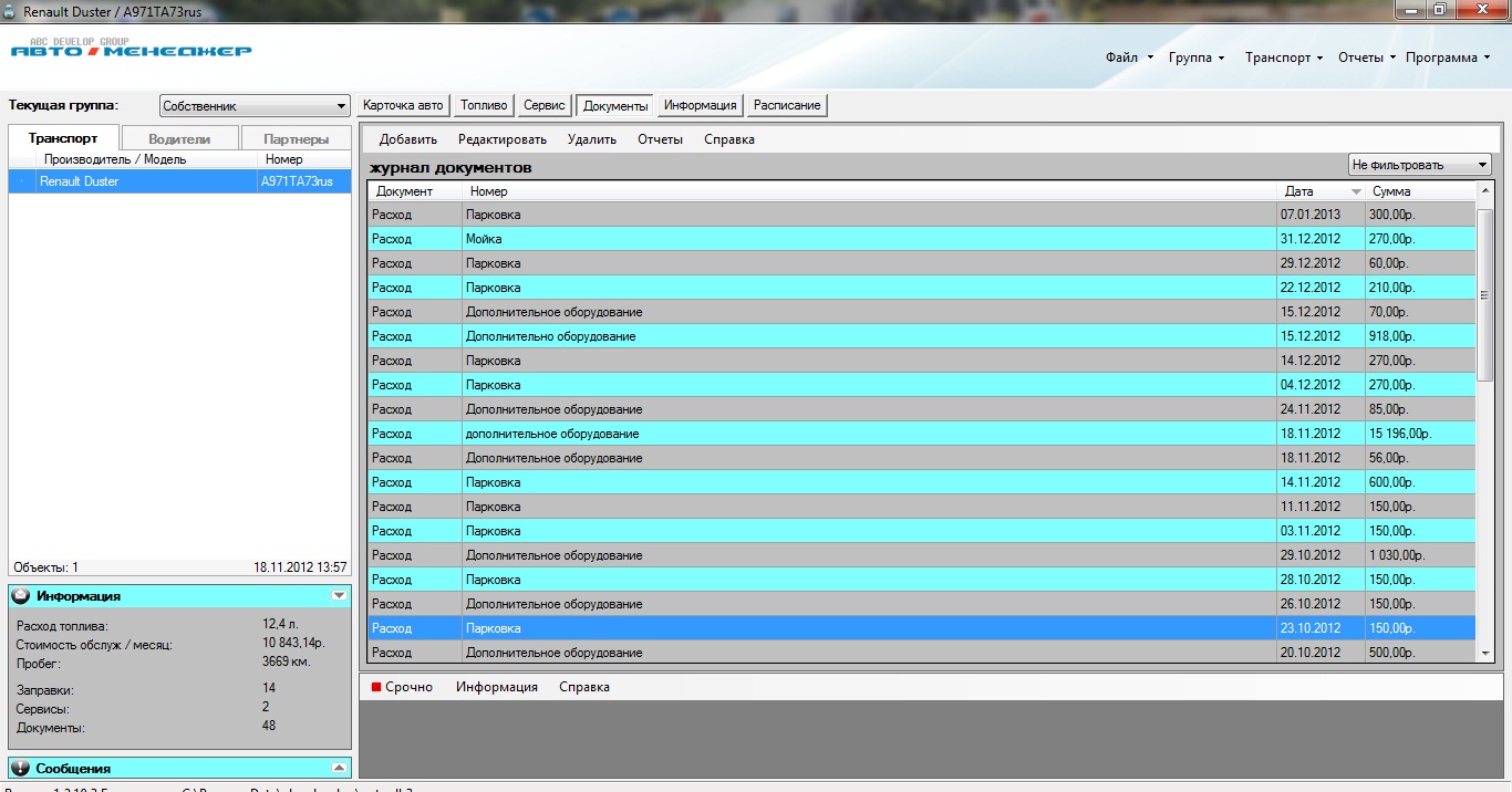 Нашел программу Авто-Менеджер на torrent... О программе: С помощью программы для автомобилей Авто-Менеджер частный автовладелец, как и крупная компания, имеющая собственный автопарк, могут систематизировать информацию, которая так или иначе имеет отношение к автотранспортным средствам. Так, к примеру, с помощью этой авто программы очень удобно и легко вести учет расходов на топливо. Точно также можно вести учет затрат на ремонт, сервисное обслуживание. Возможности программы: •Учет топлива; •Учет ремонта автомобиля; •Учет документов (техосмотр, ОСАГО, КАСКО и др.); •Возможность учета расходов и доходов; •Возможность составления каталога водителей и партнеров; •Наличие планировщика событий с возможностью гибкой настройки; •Ведение статистики (расход топлива, пробег зима/лето, усредненные расходы); •Представление данных о затратах в виде графика и круговой диаграммы; •Подробные отчеты