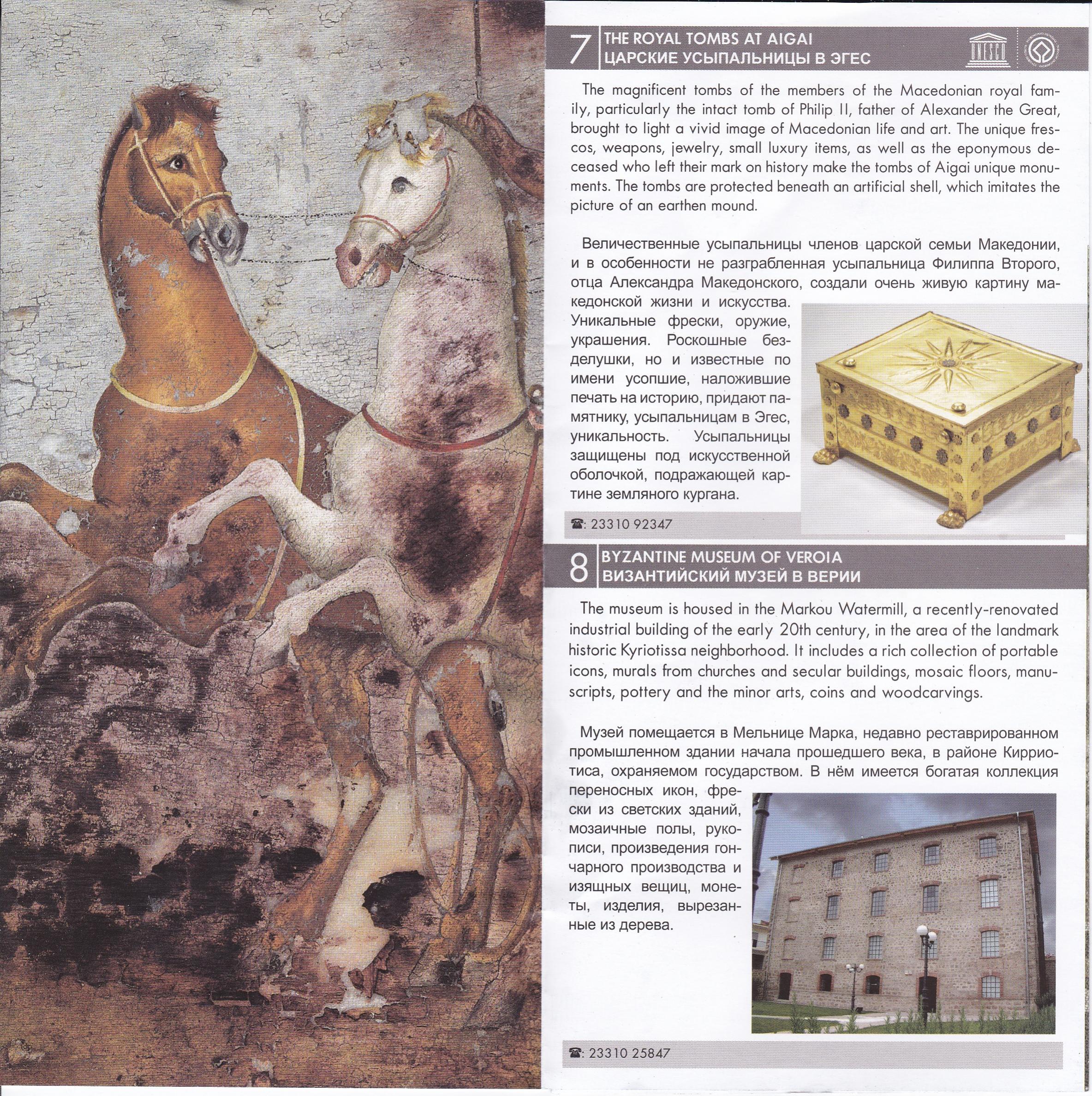 В 1977 году город Вергина стал всемирно известен, благодаря удивительным находкам греческого археолога профессора Манолиса Андроникоса. В результате проводимых им археологических раскопок подтвердилось, что Вергина была первой столицей македонского царства. Царский некрополь и соединенный с ним дворцовый комплекс ученые связывают с древним культовым центром Эгами, местом ритуальных династических празднеств и заупокойного культа македонских царей. Большинство царских захоронений было разграблено в 274 году до н.э. галльскими наемниками. Самая впечатляющая находка Андроникоса – это найденная неразграбленной гробница царя Филиппа II, отца Александра Македонского. Македонские гробницы со сводчатыми крышами, относящиеся к позднему классическому и эллинистическому периодам, строились из местного пористого камня, более поздние и богатые из них напоминали классические храмы с колоннами. Двери, как правило, делались из мрамора и подвешивались на железных петлях, внутри гробницы находились мраморные скамьи и троны, стены и фасад были оштукатурены и покрыты фресками. До начала раскопок, гробницу Филиппа II и три другие царские захоронения покрывал курган, насыпанный, вероятно, еще в древности для того, чтобы скрыть следы разрушений, причиненных галльскими грабителями. Первая разграбленная гробница (№ 1) (350 г. до н. э), тем не менее, ценна великолепно сохранившимися фресками, из которых самая впечатляющая – со сценой похищения Персефоны. Эта фреска является уникальным образцом монументальной живописи IV века до н.э. Также разграбленной была найдена «гробница со свободно стоящими колоннами», названная так потому, что свод ее обрушился, – вероятно, при насыпке кургана. Но, наибольший интерес вызывают найденные нетронутыми гробница Филиппа II и так называемая «гробница принца», которая могла принадлежать Александру IV, сыну Александра Македонского и Роксаны, убитому, по сохранившимся свидетельствам, в возрасте 13 лет. Фасад гробницы Филиппа II имитировал собой портик. Дорические колонны держат дорический же архитрав, а живописный фриз изображает сцены охоты в горных лесах. Сохранилась неповрежденной двойная мраморная дверь с рельефным изображением дверных ручек. Внутри гробницы были найдены все атрибуты, обычно сопровождающие царское захоронение. Например, массивная золотая урна с многолучевой звездой, знакомой по изображениям на македонских щитах и монетах. Также были найдены роскошный золотой венец из дубовых листьев и желудей, декоративно украшенный церемониальный погребальный щит, пурпурные и золотистые ткани, многочисленные золотые и серебряные кубки, царский скипетр, богато украшенные доспехи и оружие. Археологический музей в Вергине открыт в 1993 году. Было построено подземное сооружение, чтобы защитить гробницы и создать необходимый температурно-влажностный режим. Музейное пространство состоит из двух частей – это сами гробницы и помещение, где в витринах находятся удивительные сокровища из царских захоронений. Платная парковка рядом с музеем (цена 1,5 €, оплата не почасовая)... Координаты парковки: N 40.485058 E 22.319774
