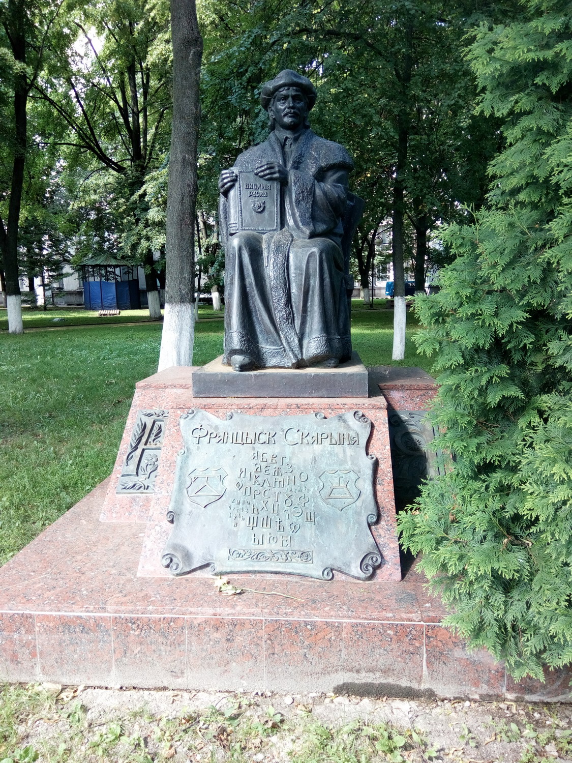 Белору́сский госуда́рственный университе́т (БГУ) Сквер за главным зданием. Туда вход оказывается был только студентов/сотрудников. Я видать сильно отличался и на входе охрана попросила показать документы (1й и последний раз, замечу, за все время где бы то ни было). Я сначала не понял что/как/зачем, начав доставать паспорт, меня остановили вопросом "зачем туда ?" - "сквер, красиво, памятники, приехал в БГУ для проведения экзаменов..." - "Проходите, пожалуйста" Нажмите здесь, чтобы увидеть весь текст