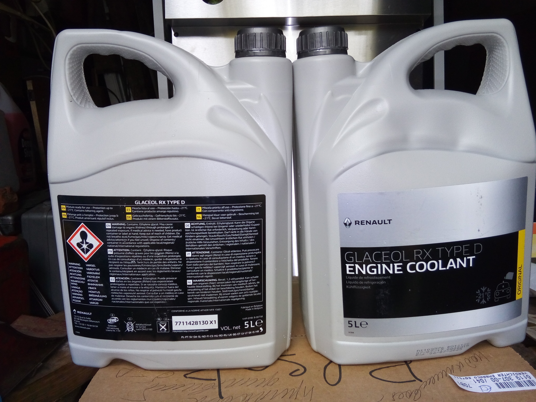 Небольшая разница в каталожном номере. Прикупил сегодня охлаждающую жидкость для двигателя. Не стал "заморачиваться", взял рекомендованное - Glaceol RX Type D, 5л, 1430 руб. Однако, в гараже, при близком рассмотрении, обнаружилась надпись до -21*С. Маленько расстроился и посмотрел пути исправления. Накопал в интернете инструкцию по разведению концентрата. Короче, 5 литров концентрации 2/3 для минус 25*С - это 2 литра концентрата и 3 литра дистиллированной воды. Чтобы получилось примерно 1/1 надо в 5 литровую канистру с готовой (-21*С) жидкостью долить 1 литр концентрата(420 руб). В результате мне надо прикупить литр концентрата. По деньгам... Чтобы получить 6 литров, подходящей для наших условий, охлаждающей жидкости (-36*С), надо купить 3 литра концентрата (420 руб на сегодня) и 3 литра дистиллированной воды (вода не знаю по чём) Вот такая история. 7711428130 - "готовый к применению" антифриз с температурой замерзания - -21*С. 7711428132 - концентрат, который надо разбавить до нужной кондиции (1/1) дистиллированной водой.