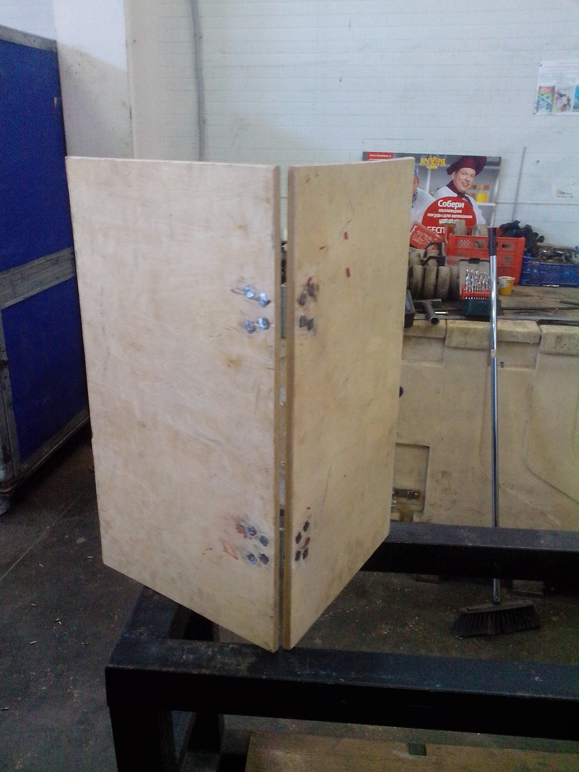 ![]() ![]() Нашел на работе 2 куска фанеры 10 мм. Купил петли,винты диам. 6 и втулки резьбовые для дерева тоже 6-ки. Ну и за обеденный перерыв собрал. ![]() Грубые края шлифанул.Болты посадил на Локтайт(на всякий случай) сварщикам заказал ноги для стола. Обещали после завтра. Потом выложу и вид готового изделия. Получился тяжеловат,но зато при том что у меня одни мужики в семье и лишь одна хрупкая девушка,то я думаю сойдет. ![]() Итого: - метизы 600 руб., - 2 куска фанеры-бесплатно, - ноги даром, Размеры 855*755-в разложенном состоянии,425,5*755-в собранном, я думаю в аккурат,станет за заднюю спинку. ![]()
