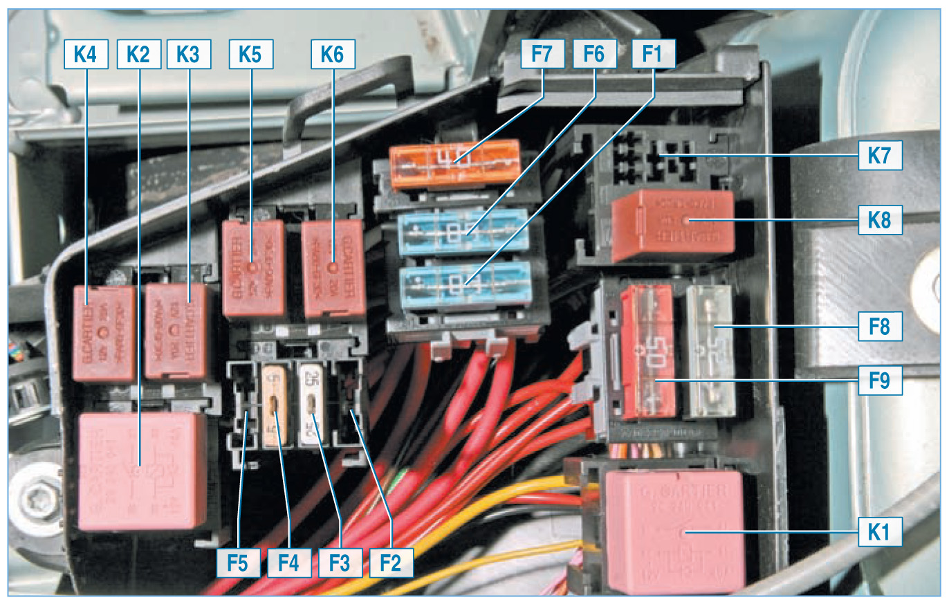 F1 60А - Предохранитель замка зажигания (104) - переключателя наружного освещения (209) F2 - 15А - Предохранитель в модификации с кондиционером, питания муфты кондиционера (171) через реле муфты кондиционера (474) на плате (784) или 30А - Предохранитель в стандартной модификации с отопителем питания электровентилятора системы охлаждения (188) через малой скорости электровентилятора системы охлаждения двигателя (700) на плате реле (784) F3 25А - Предохранитель управления и питания реле блокировки системы впрыска (238) на плате реле (1047) - питания реле топливного насоса (236) на плате реле (1047) F4 - Не используется ![]() F5 15А - Предохранитель ЭБУ автоматической коробки передач (119) F6 60А - Предохранитель цепи питания переключателя наружного освещения (209) - блока предохранителей в салоне (1016) F7 40А - Предохранитель в модификации с кондиционером питания электровентилятора системы охлаждения (262) через реле высокой скорости электровентилятора системы охлаждения (336) или через реле малой скорости электровентилятора системы охлаждения (700) на плате реле (784) и резистора электровентилятора кондиционера (321) F8 25А - Предохранитель ЭБУ АБС (118) на модификации без ESP - ЭБУ АБС и ESP (1094) на модификации с ESP F9 50А - Предохранитель ЭБУ АБС (118) на модификации без ESP - ЭБУ АБС и ESP (1094) на модификации с ESP K1 40A - Реле электровентилятора подачи холодного воздуха (233) K2 40A - Реле высокой скорости электровентилятора (336) K3 20A - Реле малой скорости электровентилятора (700) K4 20A - Реле включения кондиционера (474) K5 20A - Реле топливного насоса (236) K6 20A - Реле блокировки впрыска топлива (238) K7 - НЕ используется. ps Есть нестыковочка у Дачии и Рено по подкапотному ком. блоку...