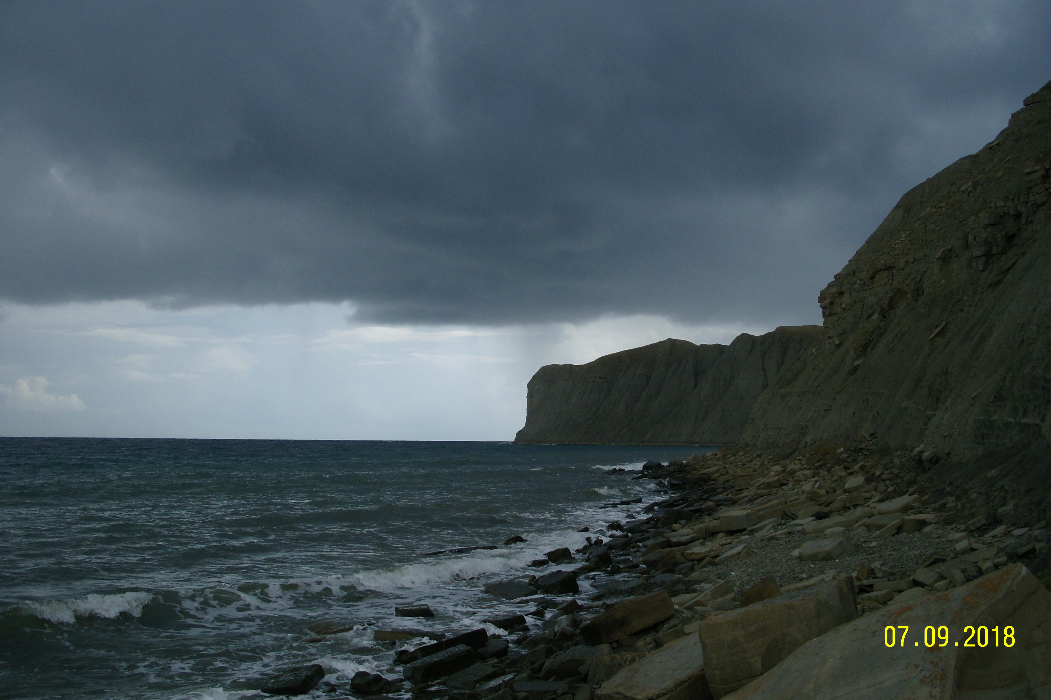 Выход чудной, сквозь бетон на метал. лестницу. Калитка закрывается, обратно не зайти. Берег мягко говоря непривлекательный, на постеры точно не попадёт. Вода после ливня мутная, потому что грунт больше похож на цемент с прослойками плитняка. Море наше, как большая помойка, не всё переваривает. Что не тонет, выбрасывает. Всё, что можно изготовить из пластика, здесь есть. За несколько километров встретили только стайку бакланов. Очень пугливые. Людей, что ли не видели? Место сушки крыльев обозначено белым. Но люди здесь иногда бывают. Стоянка 1. Стоянка 2. На картах - "развалины". По пути высматриваем пути отхода. Надо же как-то вылазить на верх, что бы вернуться. Думал попробовать подняться по ручейкам, что выходят на берег, но хорошо что не стал. Через два дня мы прошли по верху и убедились в нереальности таких вариантов. Кто-то пробовал пройти? Или с Моста принесло? Потом подошла небольшая тучка и началось настоящее приключение. |