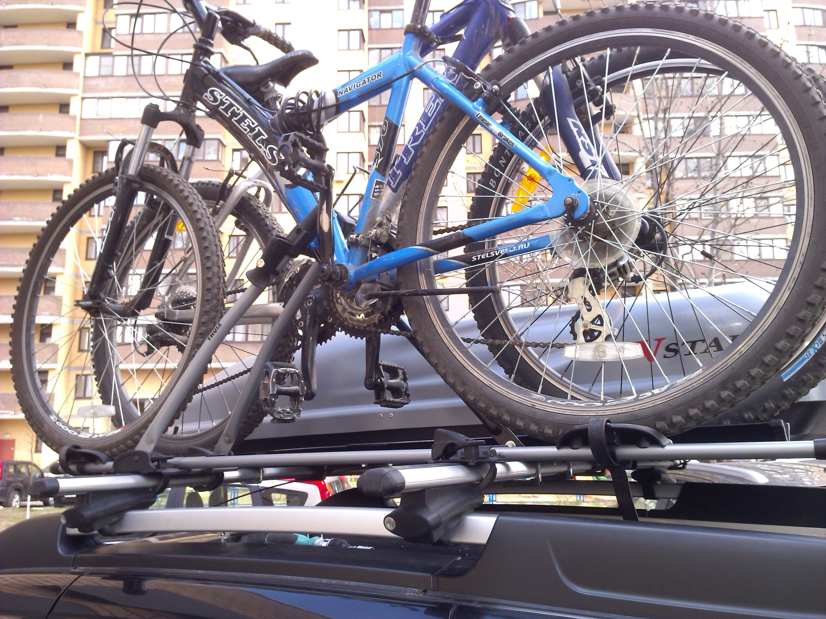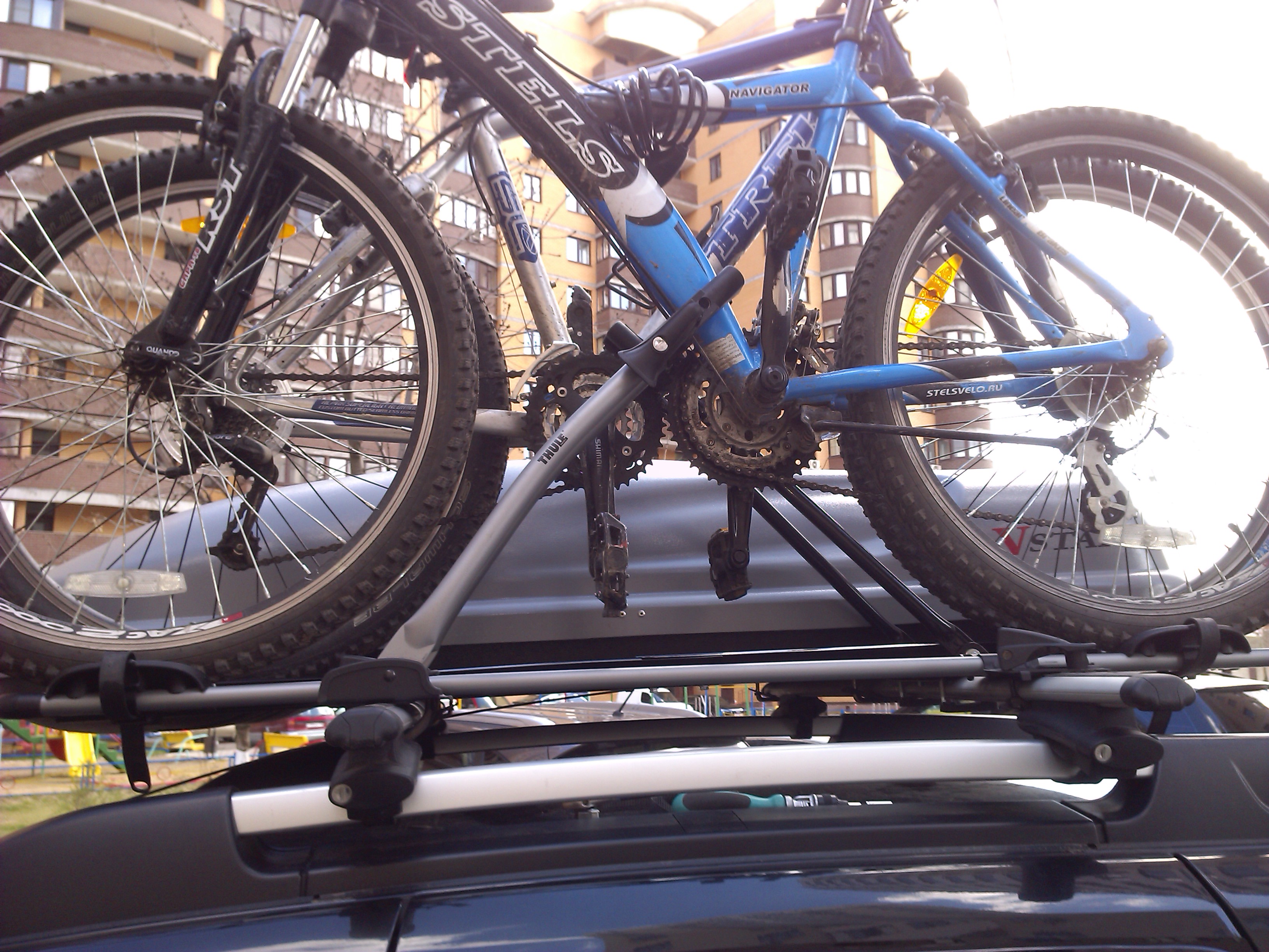 Два вела держат до 140 км/ч - больше не пробовал ))) Очень удобно грузить , благодаря лыже-углублению для переднего колеса . Вариант для 3х байков вижу крепление на фаркоп ( у туле есть откидывающаяся модель, для облегчения доступа к багажнику , бюджет 5 500р , hangon 972 )