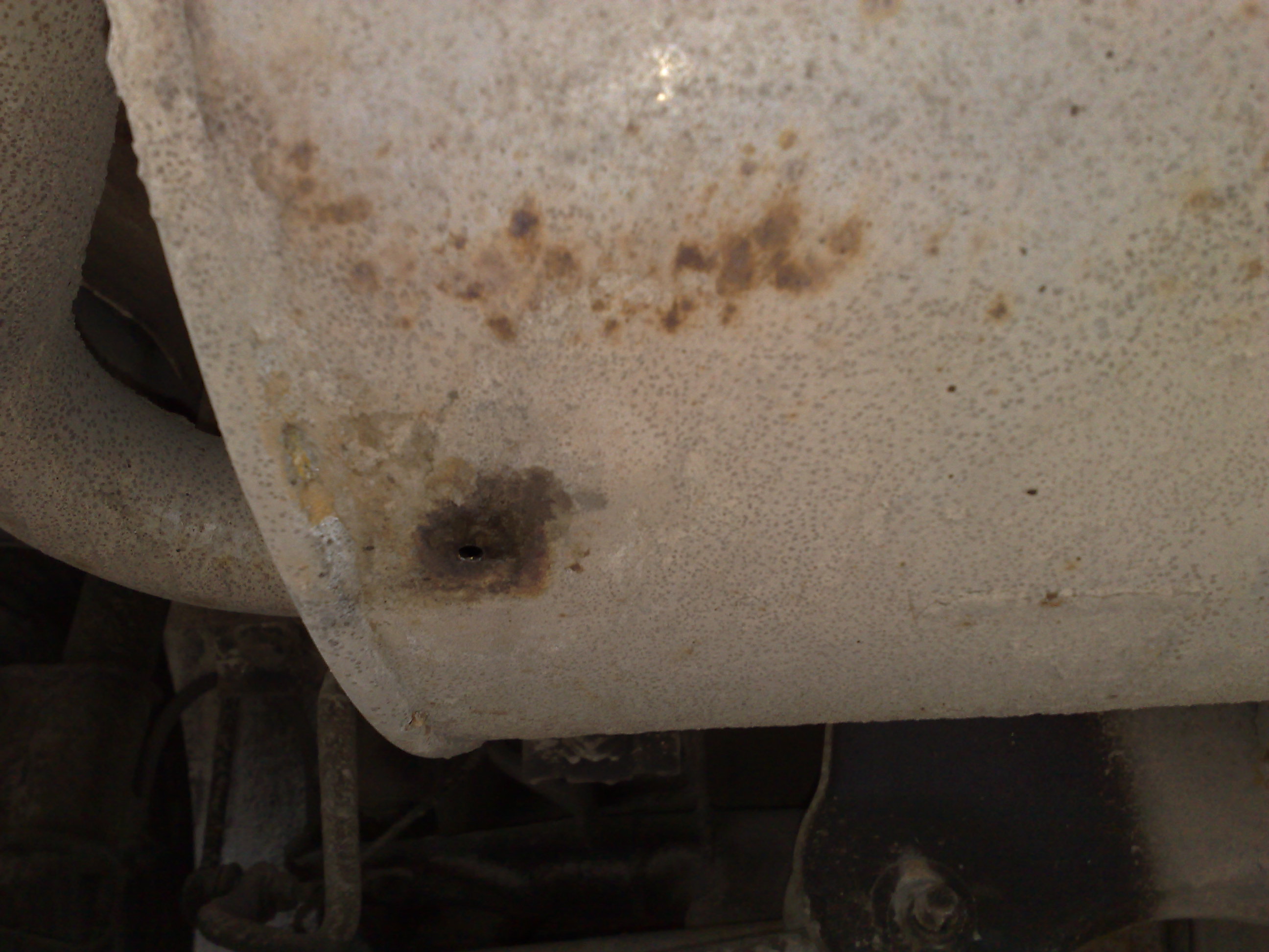 Месяц назад просверлил в глушителе два отверстия диаметром 3мм. Вытекло 100мл. конденсата.На соседнем форуме многие так делали. Особенно это касается северных районов, где глушитель быстро остывает, образуя конденсат.Я живу в средней полосе, где так же бывают холода. Бывали случаи,о них писали владельцы, когда воды- конденсата скапливалось в глушителе столько, что лед перекрывал выход газа и авто не заводилось, в сервисе просверлили отверстие , полилась вода, стали греть феном, вылилось 3 литра. Конденсат этот азотная кислота, которая разъедает глушитель изнутри. Я может с вами и соглашусь,что просверленное отверстие может разрастись и образуется большая дырка. Ее проще заварить, нежели перегородки внутри, которые сгниют от постоянного присутствия конденсата. Конденсат образуется во всех авто, не зависимо как расположен глушитель и какой двигатель. Можно утром на стоянке понаблюдать за свом глушителем и соседа рядом. Моей Дусе 1г. 4 мес.глушитель вот такой, уже ржавчина, надо было сразу просверлить отверстия, внутри тоже наверное не ахти. Вчера сделал фото, отверстия специально не протирал, на улице +20, а капли конд. были. Еще хочу пояснить для тех , кто спросит, не изменился ли звук глушителя после сверловки отверстий,отвечу, да посторонний характерный звук присутствует, но слушен только когда стоишь рядом с глушителем. Сверлить или нет, ваше дело.Спорить и доказывать что либо, бесполезно,т.к у всех свое видение по этому вопросу. Время покажет !!!