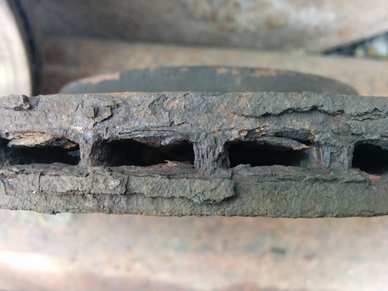 Оригинальные диски и колодки стояли TRW, не скажу, что хорошие. Во-первых, колодки жесткие. Мне их хватило на 95 ткм. Дисков тоже хватило на 95 ткм. Но это все лирика. Такого гуано еще не видел, все внутренности вентилируемого диска забиты кусочками корродирующего металла. Весь диск (где не трется о колодки) в какой-то дикой ржавой коросте. Вот такие пироги... |
