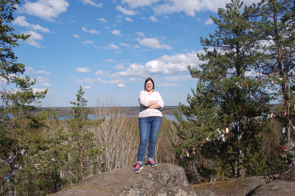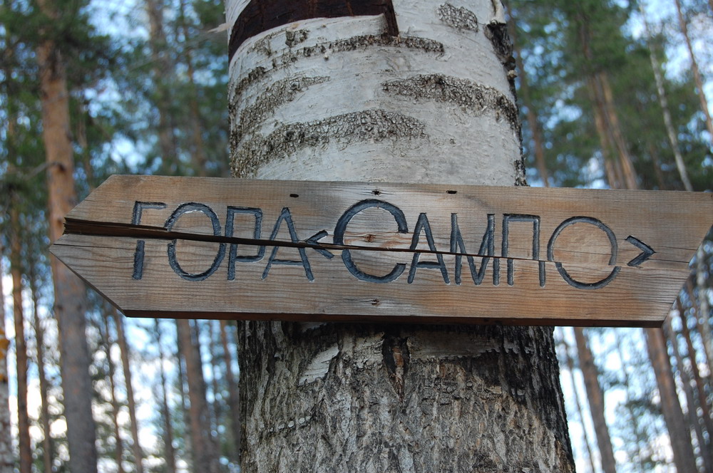 Есть в карельских краях и гора Сампо, названная в честь чудо-мельницы. Находится она в Кондопожском районе в 37 км от центра Петрозаводска. Гора Сампо представляет собой поросшую лесом возвышенность, высотой около 30-40 метров (над дорогой, с обратной стороны больше). На её склонах проложены пешеходные тропы с указателями и установлены лестницы с перилами. Таким образом, подъем на вершину вполне комфортен. На высоте оборудована смотровая площадка, с которой открываются великолепные пейзажи. Внизу шумит вековой лес и расстилается красивейшее Кончезеро – рай для рыбаков и любителей отдыха на воде. Нашли какое-то интересное дерево/кустарник, которое не смогли сразу идентифицировать Пора назад, наверх: Потом поехали назад и остановились на пикничок на берегу озера: