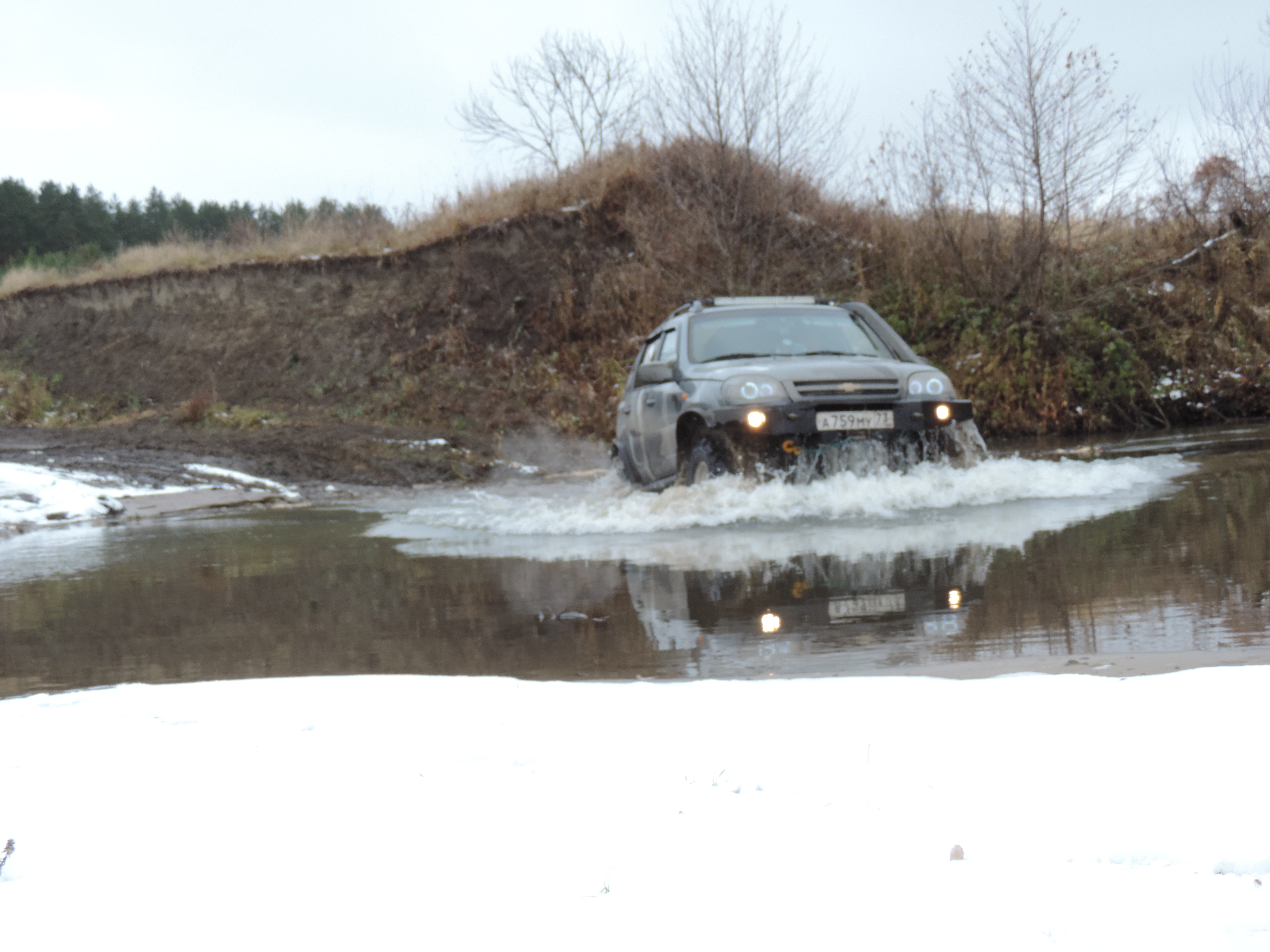 Горы известны своими частыми и быстрыми сменами погоды. Снег может пойти в середине лета, и внезапные дожди могут сделать реки непроходимыми за считанные часы. Всегда берите с собой теплую одежду и достаточный запас продовольствия. Броды Желательно сначала перебродить пешком чтобы убедиться в безопасности. Если глубина более чем по колено и скорость течения не позволяет ходить то на стандартной машине не стоит бродить. Для более глубоких бродов со спокойной водой требуется: » Шноркель чтобы вода не попала во впускной канал двигателя » Обработать электрику двигателя водооталкивающим спреем и ослабить или снять ремень вентилятора чтобы он не загнулся об воду и не повредил радиатор. » Ехать вброд лучше на 2 пониженной передаче. Держать равномерно устойчивые обороты. В воде лучше не переключаться так как из-за воды сцепление будет работать с опозданием. » В случае застревания не глушите двигатель. » Если двигатель глохнет не пытайтесь дать газу. Очень вероятно что он набрал воды и увеличение оборотов разрушит его. Автомобиль стоит вытащить из воды с помощью лебедки ли другой машины » После брода стоит проверить картеры агрегатов на предмет загрязнения водой Подъемы и спуски