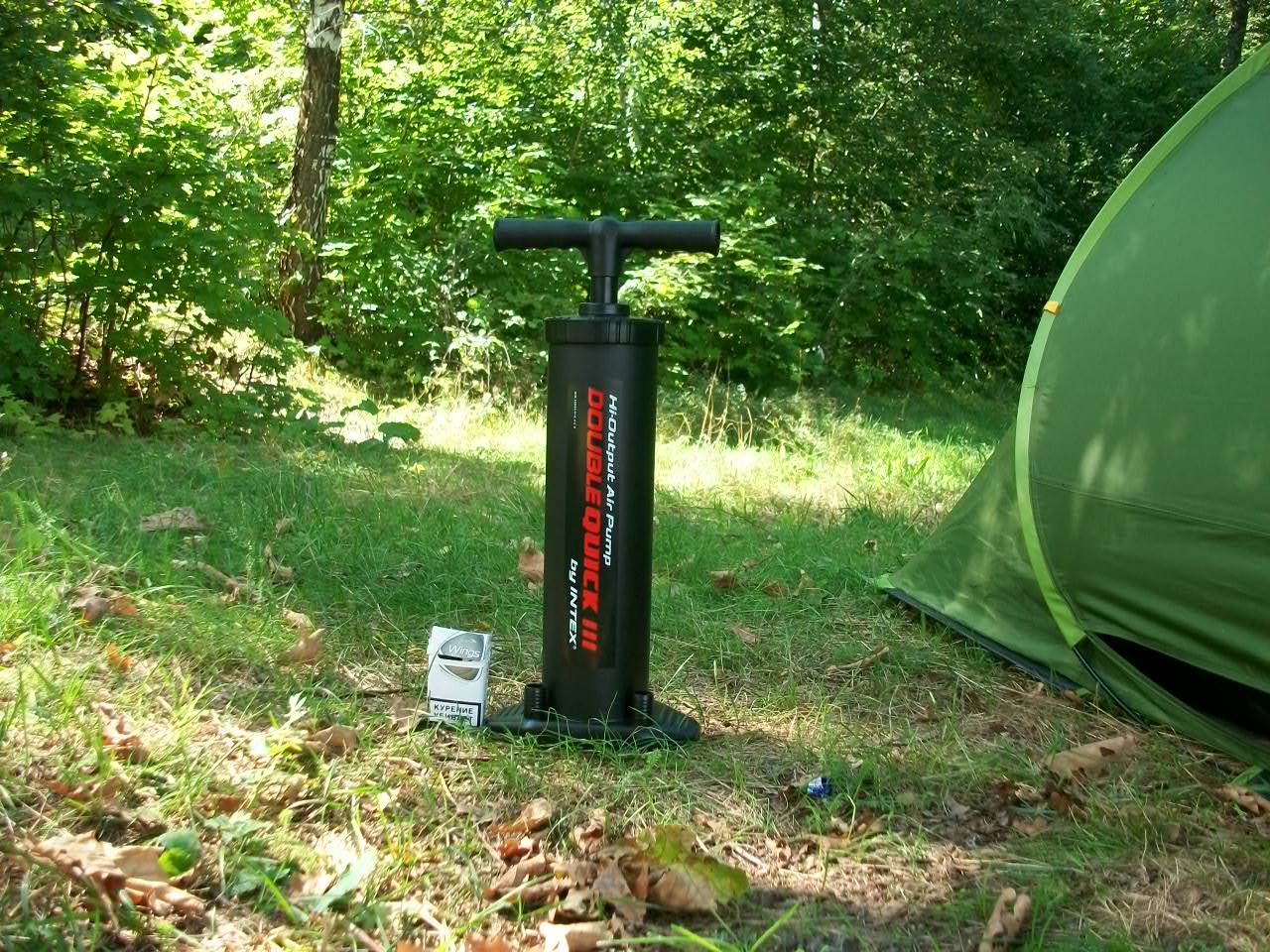 Очень полезная вещица... Насос (5 литров) для накачки разных походных аксессуаров. Работает (накачивает) в каждом движении штока - вверх и вниз.. Можно откачать остаточный воздух. Шланг и насадки в комплекте.