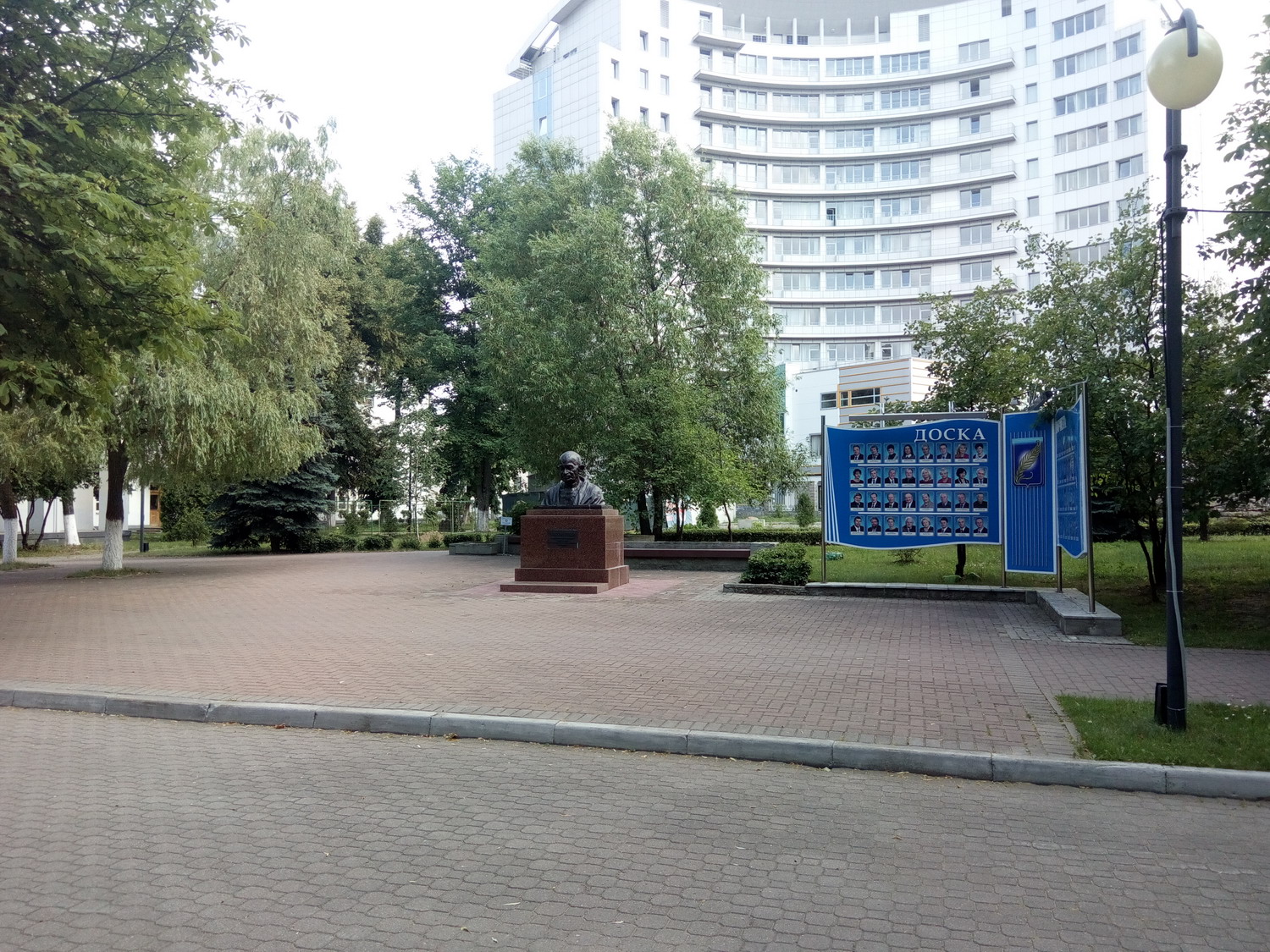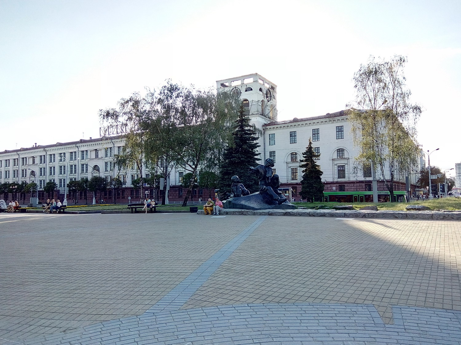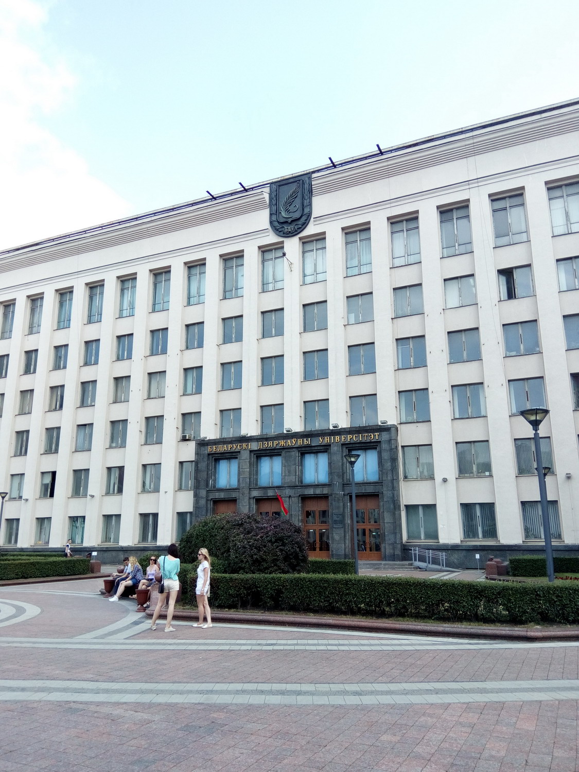 Белору́сский госуда́рственный университе́т (БГУ) Сквер за главным зданием. Туда вход оказывается был только студентов/сотрудников. Я видать сильно отличался и на входе охрана попросила показать документы (1й и последний раз, замечу, за все время где бы то ни было). Я сначала не понял что/как/зачем, начав доставать паспорт, меня остановили вопросом "зачем туда ?" - "сквер, красиво, памятники, приехал в БГУ для проведения экзаменов..." - "Проходите, пожалуйста" Нажмите здесь, чтобы увидеть весь текст