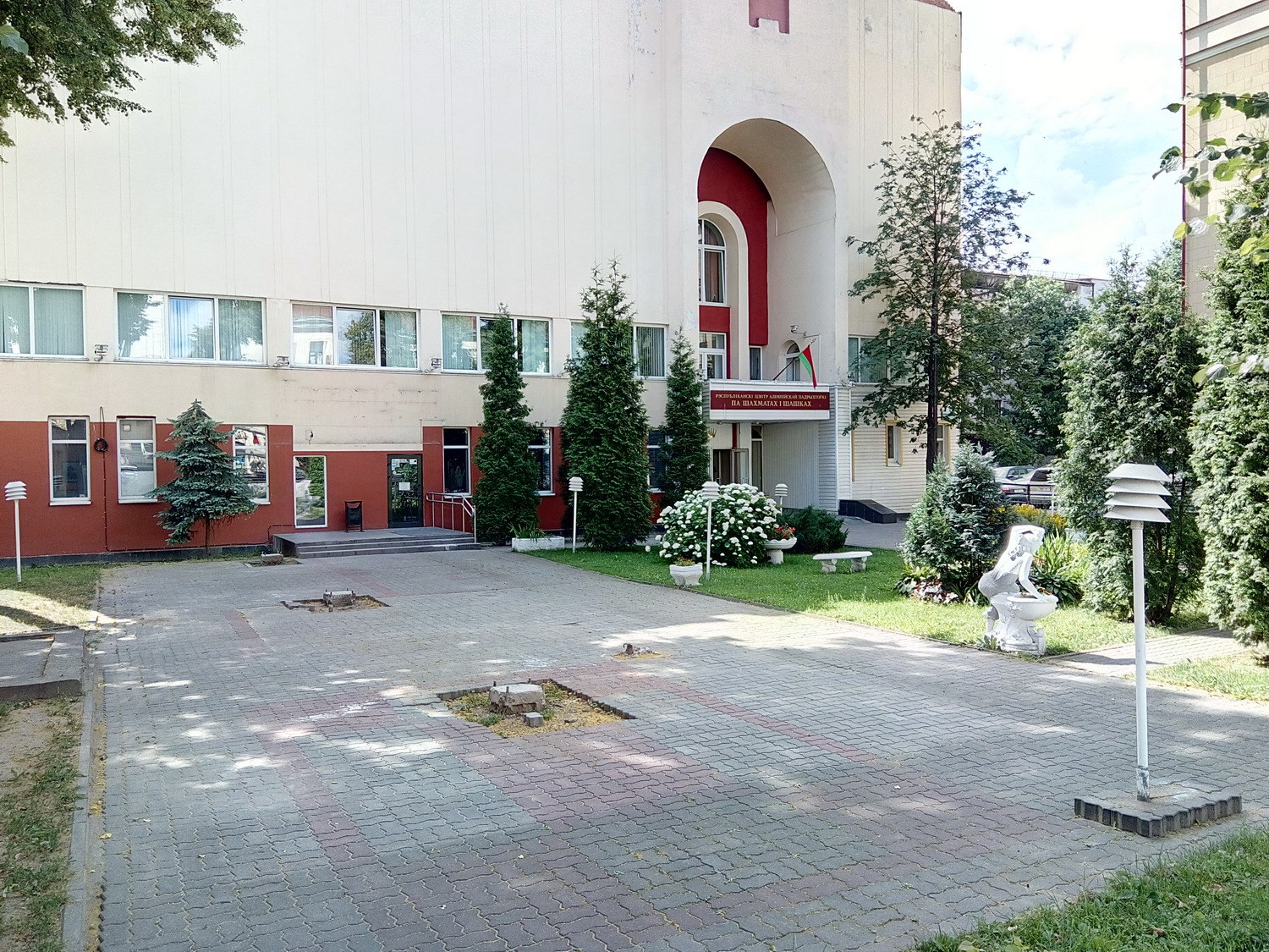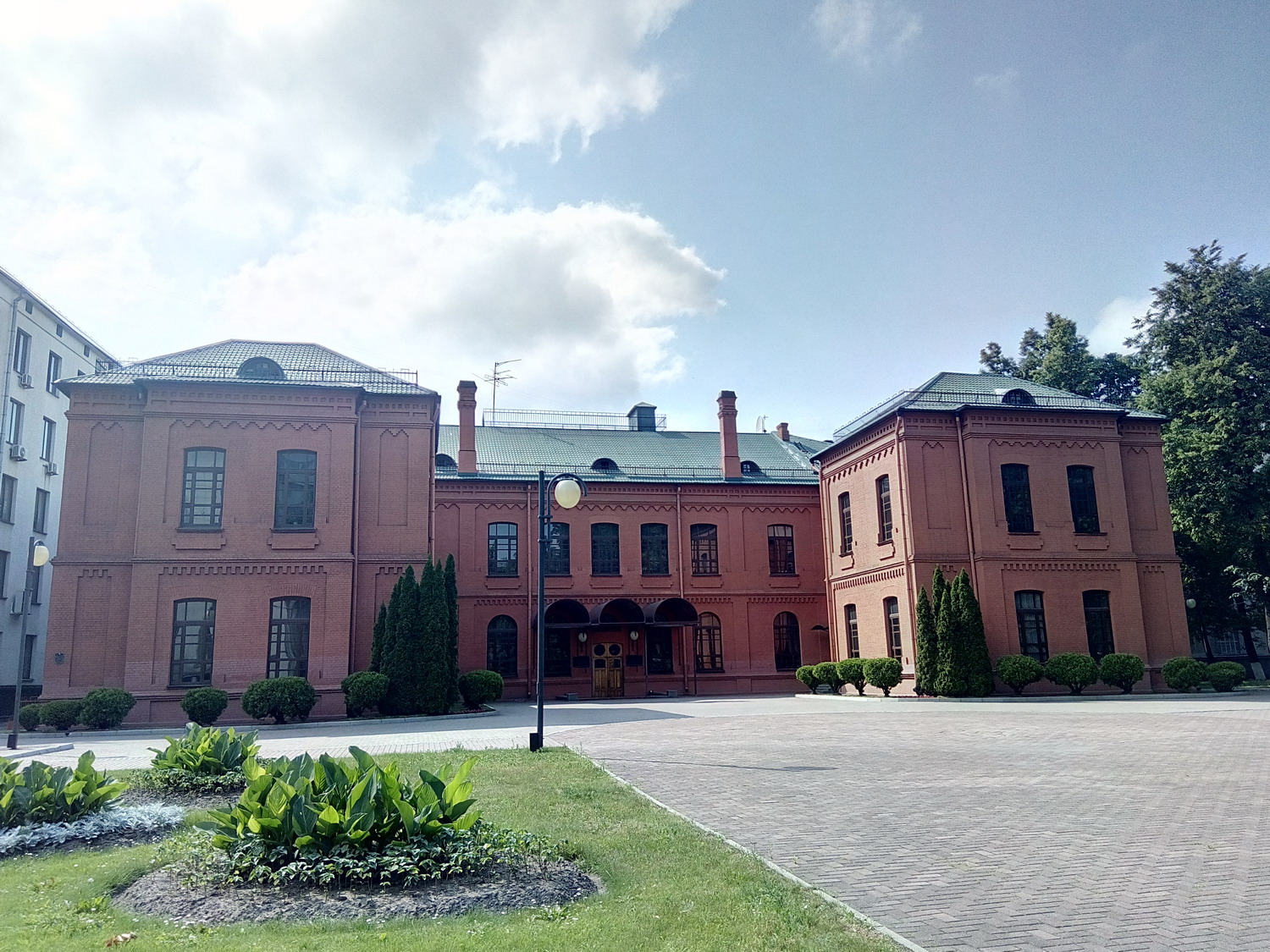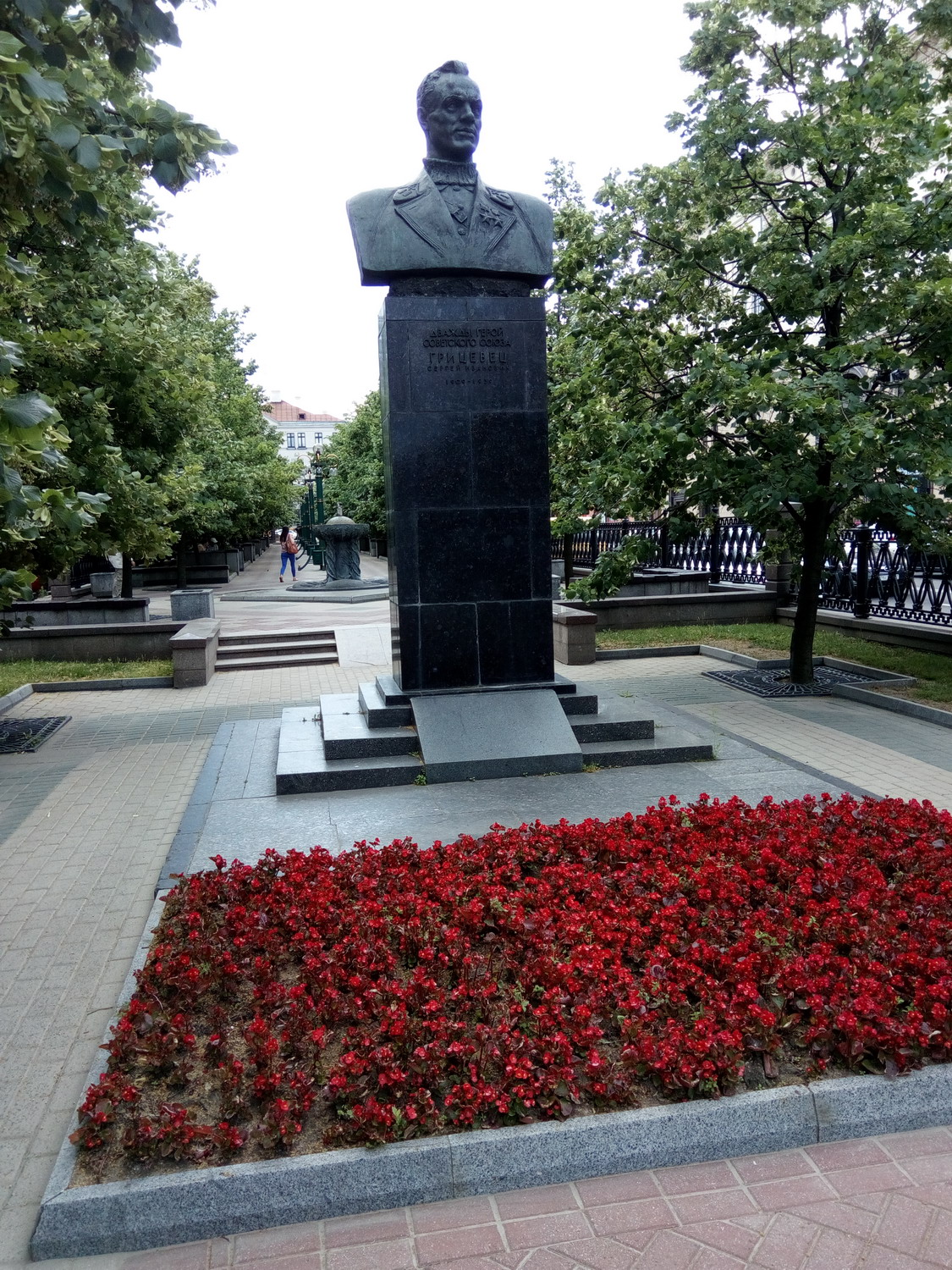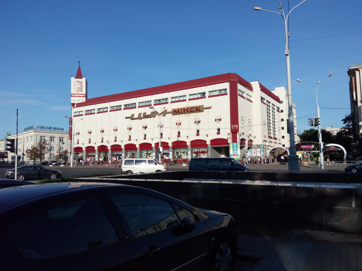 Белору́сский госуда́рственный университе́т (БГУ) Сквер за главным зданием. Туда вход оказывается был только студентов/сотрудников. Я видать сильно отличался и на входе охрана попросила показать документы (1й и последний раз, замечу, за все время где бы то ни было). Я сначала не понял что/как/зачем, начав доставать паспорт, меня остановили вопросом "зачем туда ?" - "сквер, красиво, памятники, приехал в БГУ для проведения экзаменов..." - "Проходите, пожалуйста" Нажмите здесь, чтобы увидеть весь текст