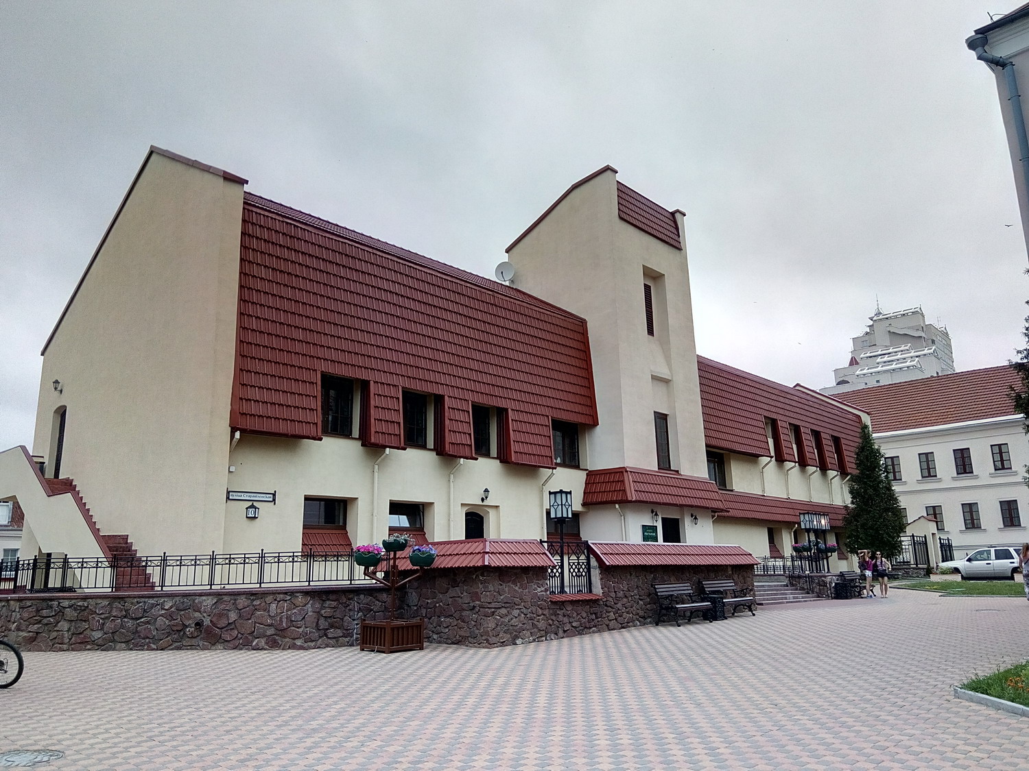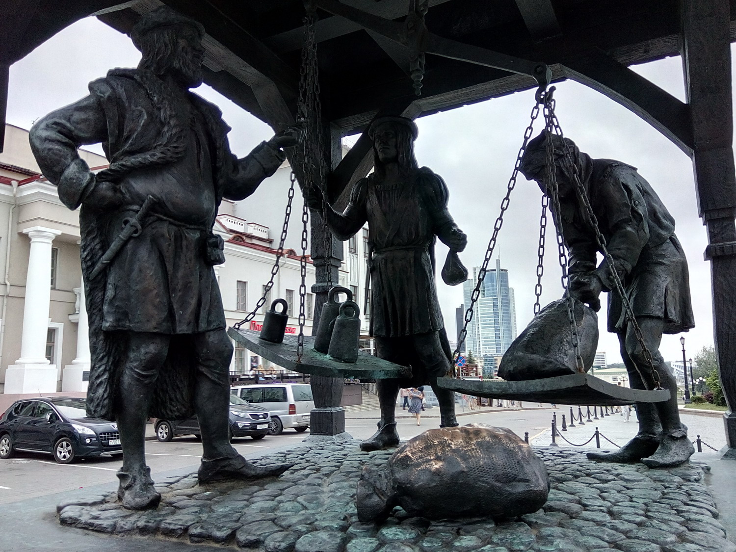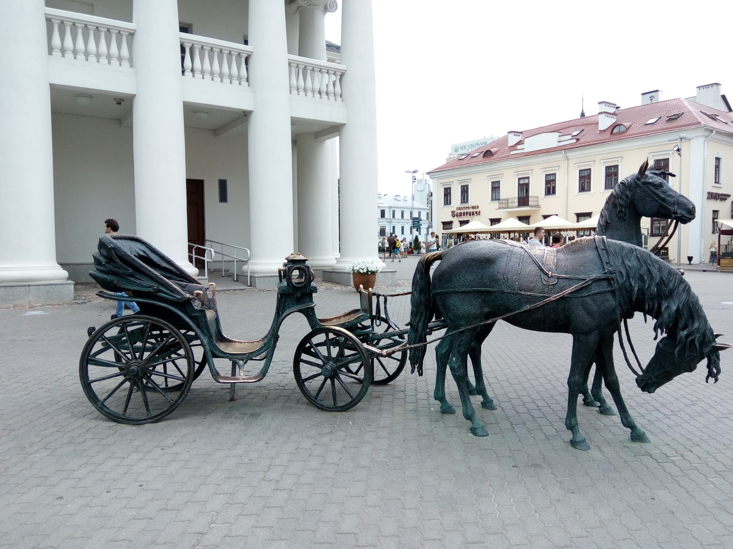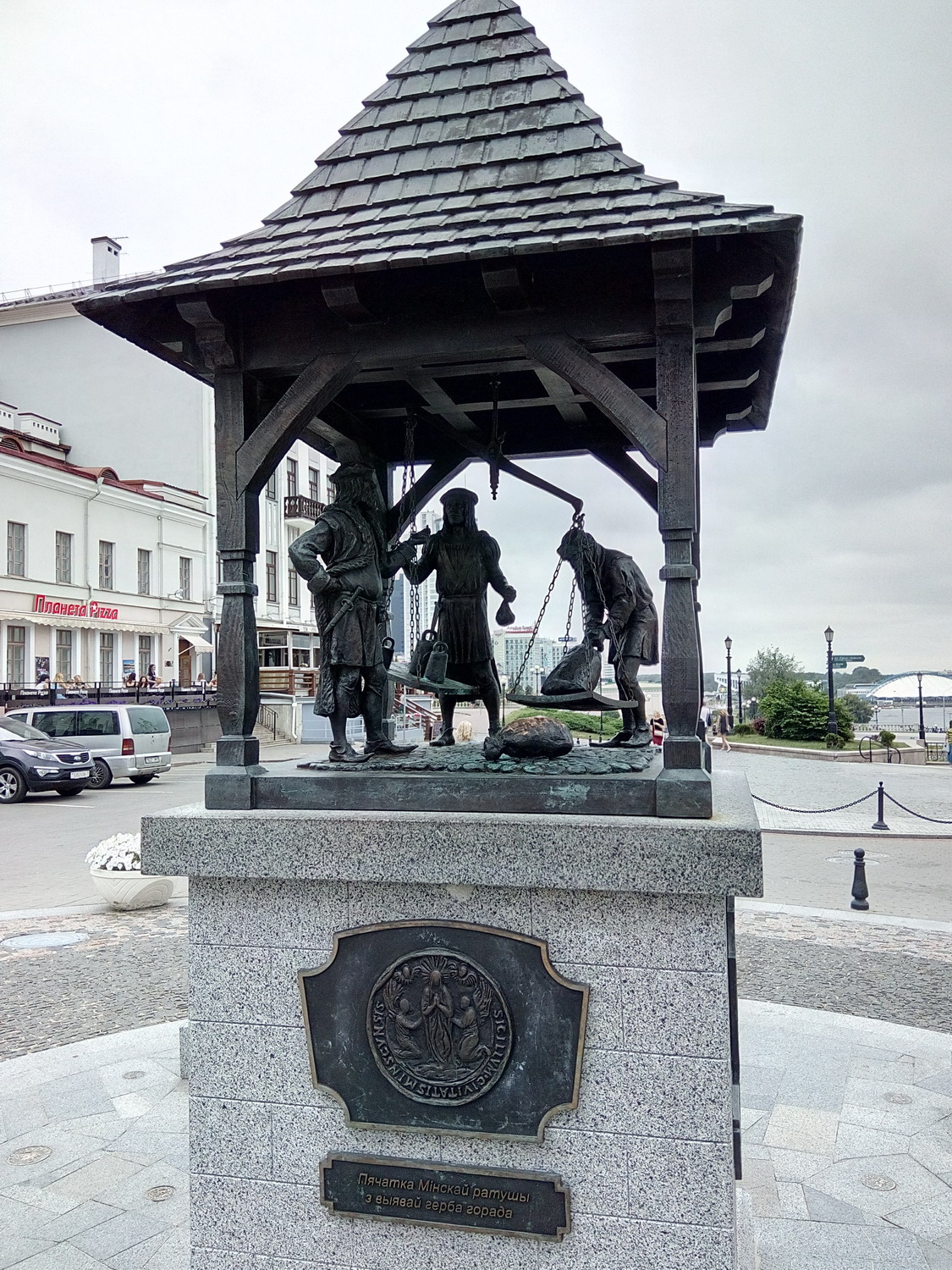 Киоск с книгами и газетами Архикафедральный собор Святого Имени Пресвятой Девы Марии. Храм был построен в 1700—1710 гг. Минская городская ратуша — административное здание в центральной части Минска, на Высоком Рынке, построено в 1600 году. На ратушной башне находились часы, что для того времени было большой ценностью.До отмены российскими властями магдебургского права для Минска (14 мая 1795) в ратуше проходили заседания органа минского самоуправления — магистрата или совета, в здании хранились эталоны единиц веса и объема. Памятник Магдэбургскае права Карета губернатора Захария Корнеева Городские весы