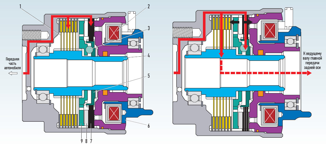 Конструктивно схемы работы подключаемого полного привода «Рено-Дастер» и «Мазды СХ-5» близки. У обоих автомобилей есть электронная муфта, расположенная в корпусе редуктора задней оси. Она, руководствуясь информацией о разности скоростей вращения передних (основных ведущих) и задних колес, приходящей через датчики антиблокировочной системы на блок управления, при необходимости блокируется, подключая вторую ось. Алгоритм управления муфтой довольно сложный и зависит от ряда внешних факторов. Схема работы полного привода «Мазды СХ-5» такова. При равномерном движении, когда скорости колес одинаковые, крутящий момент подается на корпус муфты (4). Диски (5) управляющей муфты разомкнуты. Ведомый (1) и ведущий (7) диски неподвижны друг относительно друга и вращаются вместе с ведомым валом муфты (9), соединенным с валом главной передачи задних колес. Крутящий момент на задние колеса не передается. Как только колеса передней оси начинают проскальзывать (угловая разница 15–20 градусов), блок управления полным приводом подает сигнал на электромагнитную катушку (2). Под действием магнитного поля якорь (8) притягивается к ней и сжимает диски управляющей муфты (5), которые соединяют ведущий диск с корпусом муфты (6). Из-за разности их скоростей ведущий диск проворачивается, шарики (3) смещаются по наклонной направляющей канавке и сдвигают ведомый диск, который сжимает диски главной муфты, – муфта включена. Для отключения муфты блок управления снимает сигнал с катушки, диски управляющей муфты размыкаются, ведущий диск проворачивается, шарики возвращаются в исходное положение – диски главной муфты размыкаются. Это произойдет не только при установившемся равномерном движении, но и при срабатывании антиблокировочной системы и системы динамической стабилизации. Чтобы сберечь муфту от повреждений в тяжелых условиях, предусмотрена защита. При нагреве масла в редукторе до 100 градусов блок управления отключает муфту и не включит ее до тех пор, пока температура не понизится до 60 градусов. Источник: http://www.zr.ru/content/articles/47...dut_dva_v_ume/ http://duster-clubs.ru/forum/attachm...3&d=1377885718 |