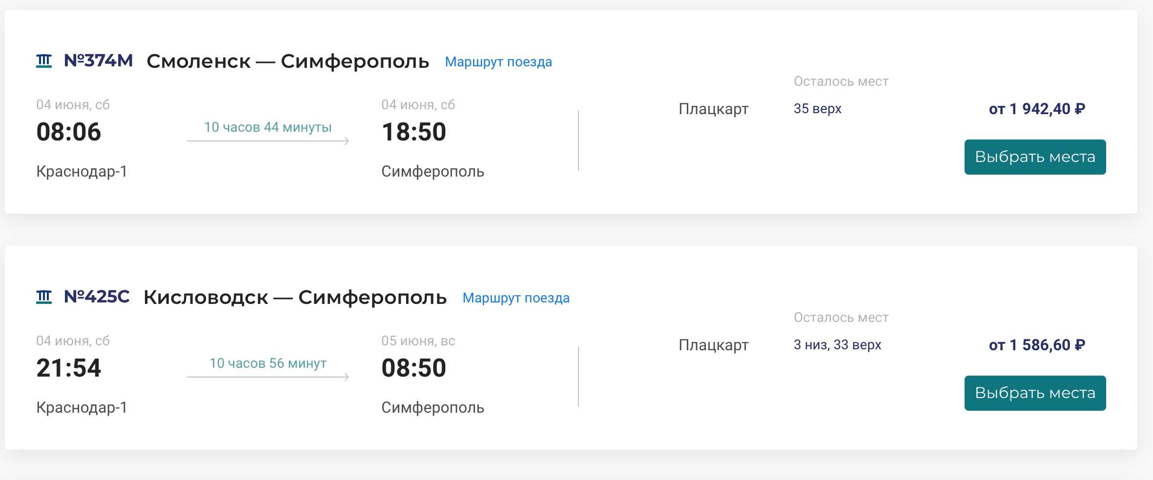 без проблем из Краснодара №316Э Адлер — Симферополь 04 июня, сб 23:25 Краснодар-1 10 ч. 55 м. 05 июня, вс 10:20 Симферополь Осталось мест Плац 182 низ, 185 верх от 1 719,30 ₽ Купе 40 низ, 41 верх от 3 766,50 ₽ СВ 18 низ от 7 443,00 ₽ в Краснодар №374С Симферополь — Смоленск 04 июня, сб 10:55 Симферополь 11 ч. 10 м. 04 июня, сб 22:05 Краснодар-1 Осталось мест Плац 112 низ, 180 верх от 1 586,60 ₽ Купе 26 низ, 46 верх, 2 места от 2 779,70 ₽ после 22:05 2 поезда до полуночи с Краснодара здесь https://ticket.rzd.ru |