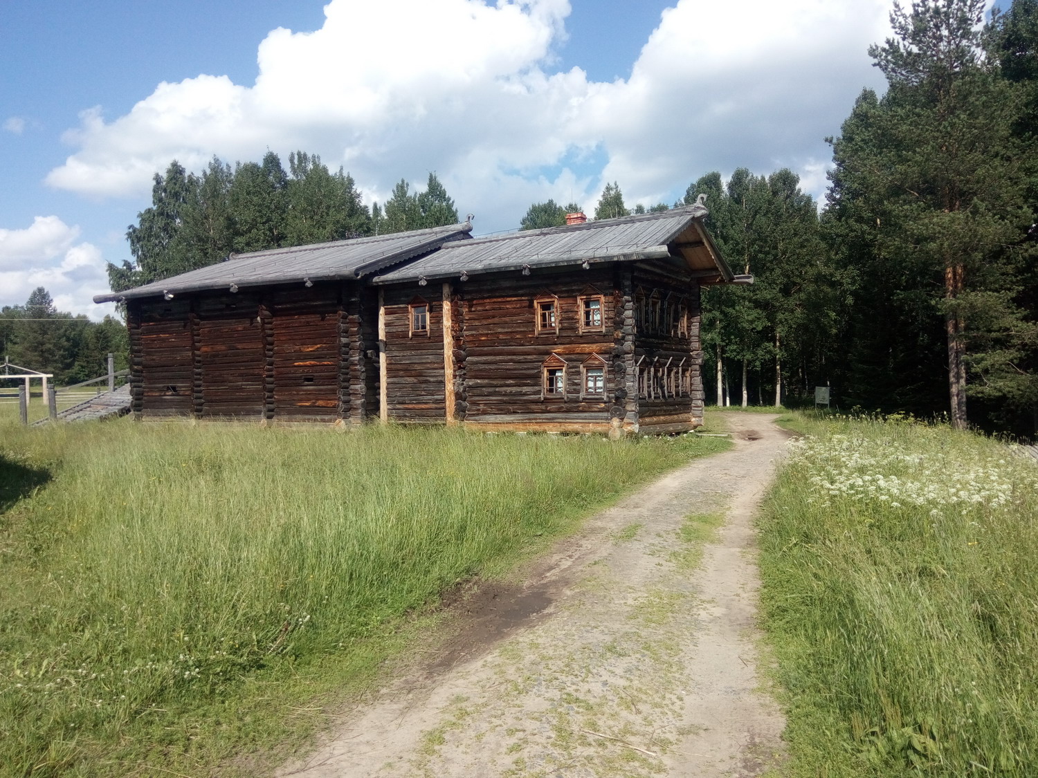 Архангельская губерния, Мезенский уезд, Дорогорская волость, деревня Елкино. Дом-шестистенок, или изба-двойня. Жилая часть представляет собой два поставленных рядом сруба, объединённых общим фронтоном. В одном срубе была изба, в другом горница. Оба помещения топились «по-белому». Жилая часть и хозяйственный двор соединены сенями. В сени ведёт высокое четырехстолбное крыльцо, с выгнутой кровлей. Тип соединения жилой и хозяйственной части дома — «брус». Ко двору прирублена зимняя изба, состоящая из двух смежных комнат и небольших сеней. Декор дома лаконичен. Наличники на окнах гладкие, с фигурной порезкой нижних и верхних досок. Завершение бревна-охлупня вырезано в форме конской головы. Причелины с круглыми отверстиями и полукружиями по краю, заканчиваются решёткой с кистями. http://www.duster-clubs.ru/forum/att...chmentid=73599 http://www.duster-clubs.ru/forum/att...chmentid=73600 http://www.duster-clubs.ru/forum/att...chmentid=73601 Дом-двор Федотова М. А., XIX век