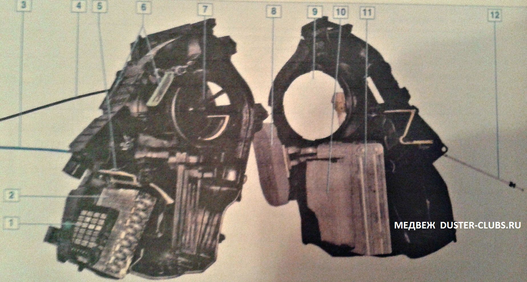 1.Воздуховод к боковому дефлектору. 2.Воздуховод к решетке обдува ветрового стекла. 3.Воздуховод к центральным дефлекторам. 4.Электродвигатель вентилятора отопления. 5.Воздуховоды к ногам передних пассажиров. 6.Воздуховоды к ногам пассажиров заднего сиденья. 7.Отопитель. 8.Дополнительный резистор вентилятора отопления. Элементы отопления( для наглядности показано на разобраном пополам корпусе отопления). 1.Дополнительный электрообогреватель салона. 2.Радиатор отопления 3.Тяга заслонки регулятора температуры 4.Тяга заслонки рециркуляции. 5.Заслонка регулятора температуры. 6.Распредилительная заслонка. 7.Заслонка рециркуляции. 8.Уплотнитель. 9.Гнездо ветилятора. 10.Салонный фильтр. 11.Испаритель кондиционера. 12.Тяга распределительных заслонок.