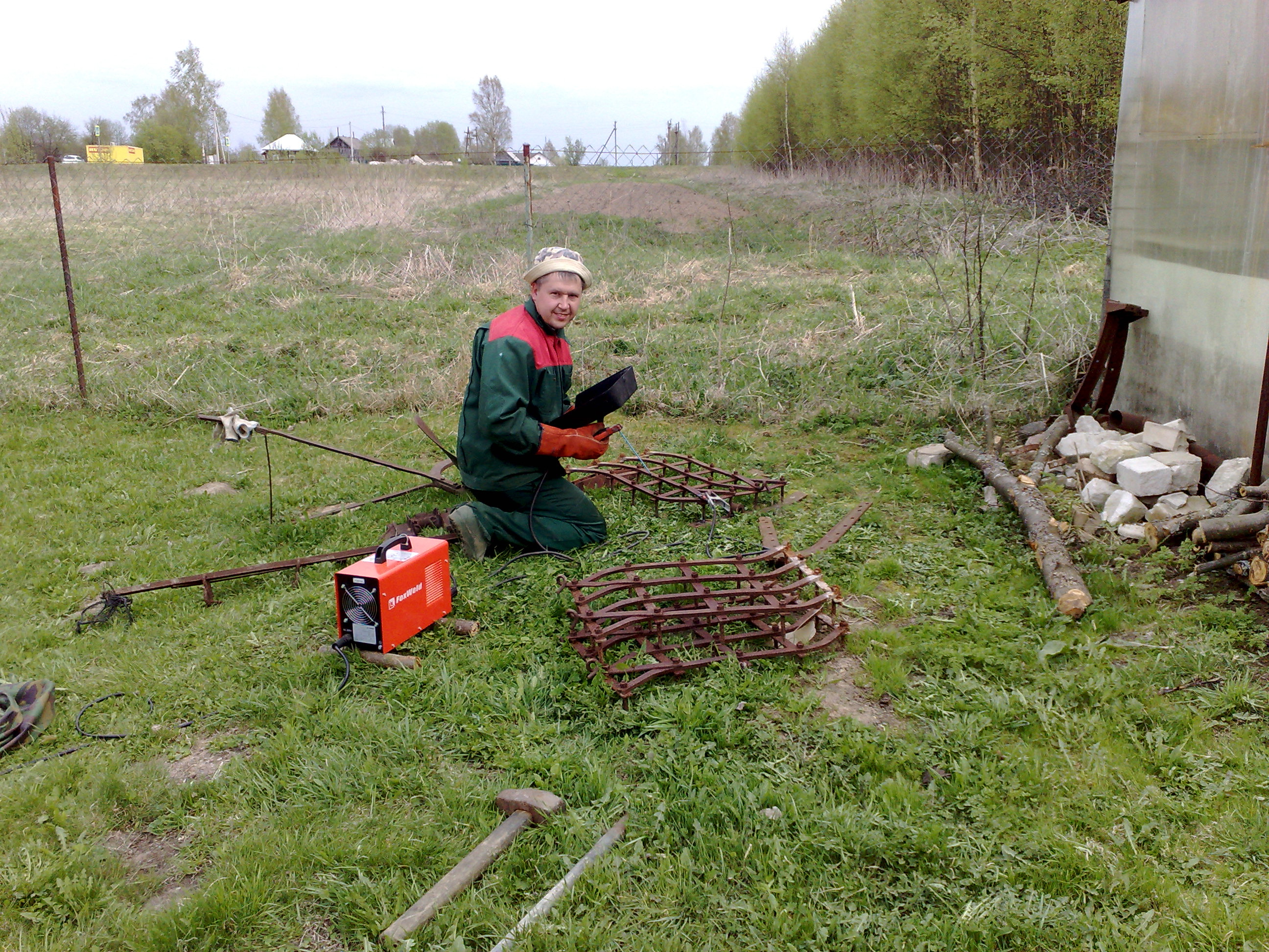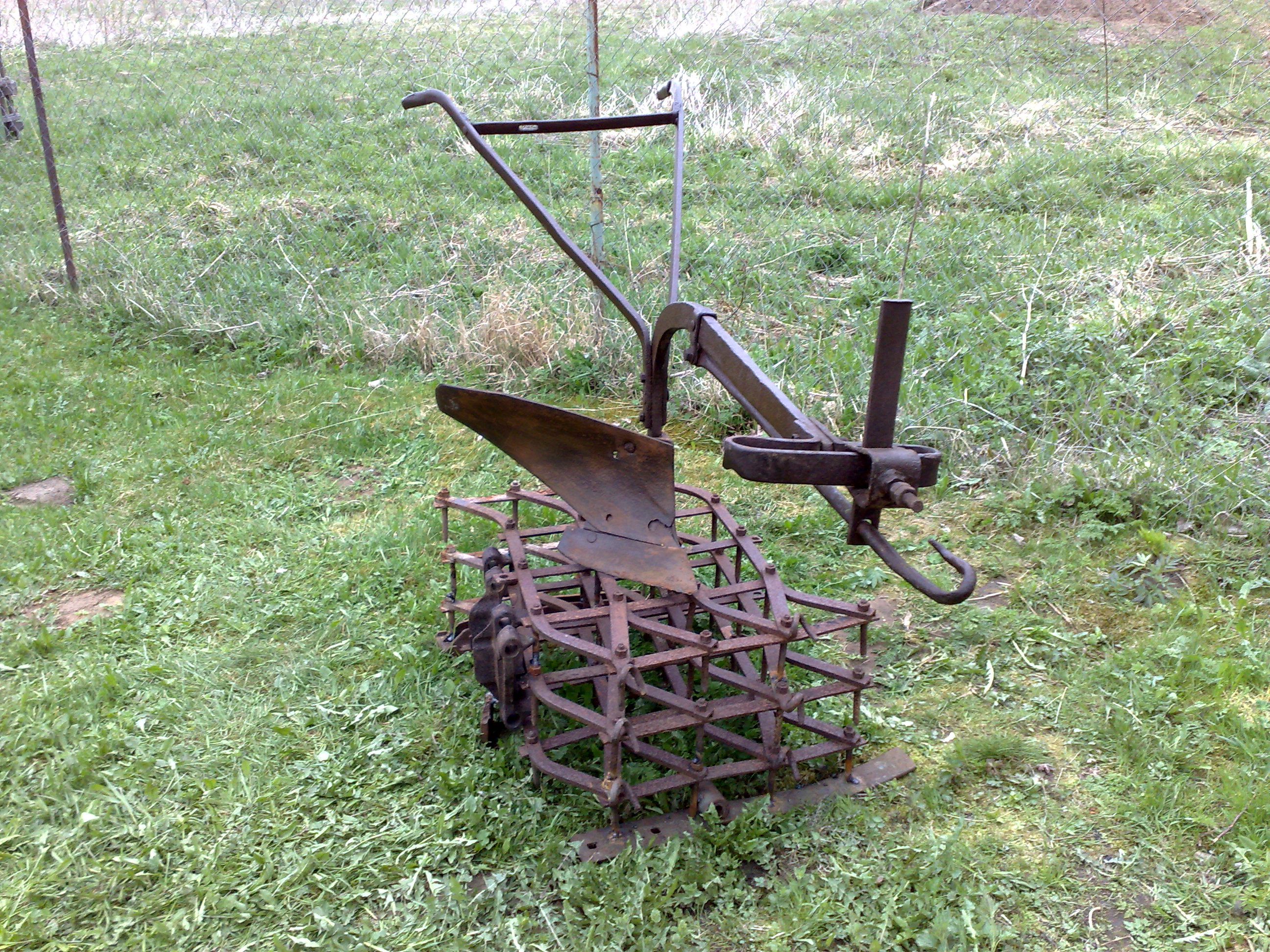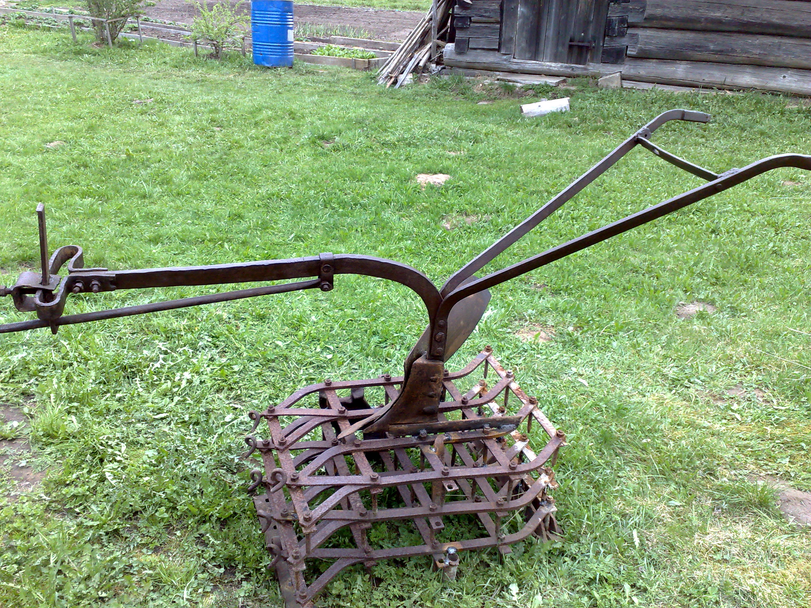 На даче тесть хотел выбросить конный кованный плуг, я не дал так как появилась идея. На мои расспросы , он пояснил, что во время войны ему было 12 лет, сейчас 85, он ходил за этим плугом, а тянули его шесть женщин,мужики на фронте. С его слов , этот плуг принадлежал колхозу, его делал местный кузнец примерно в 1930г. Теперь насчет идеи. Решил я сделать в огороде памятник, да и старые бороны тех давних времен пригодились, для своих потомков. Зять помог сварить.