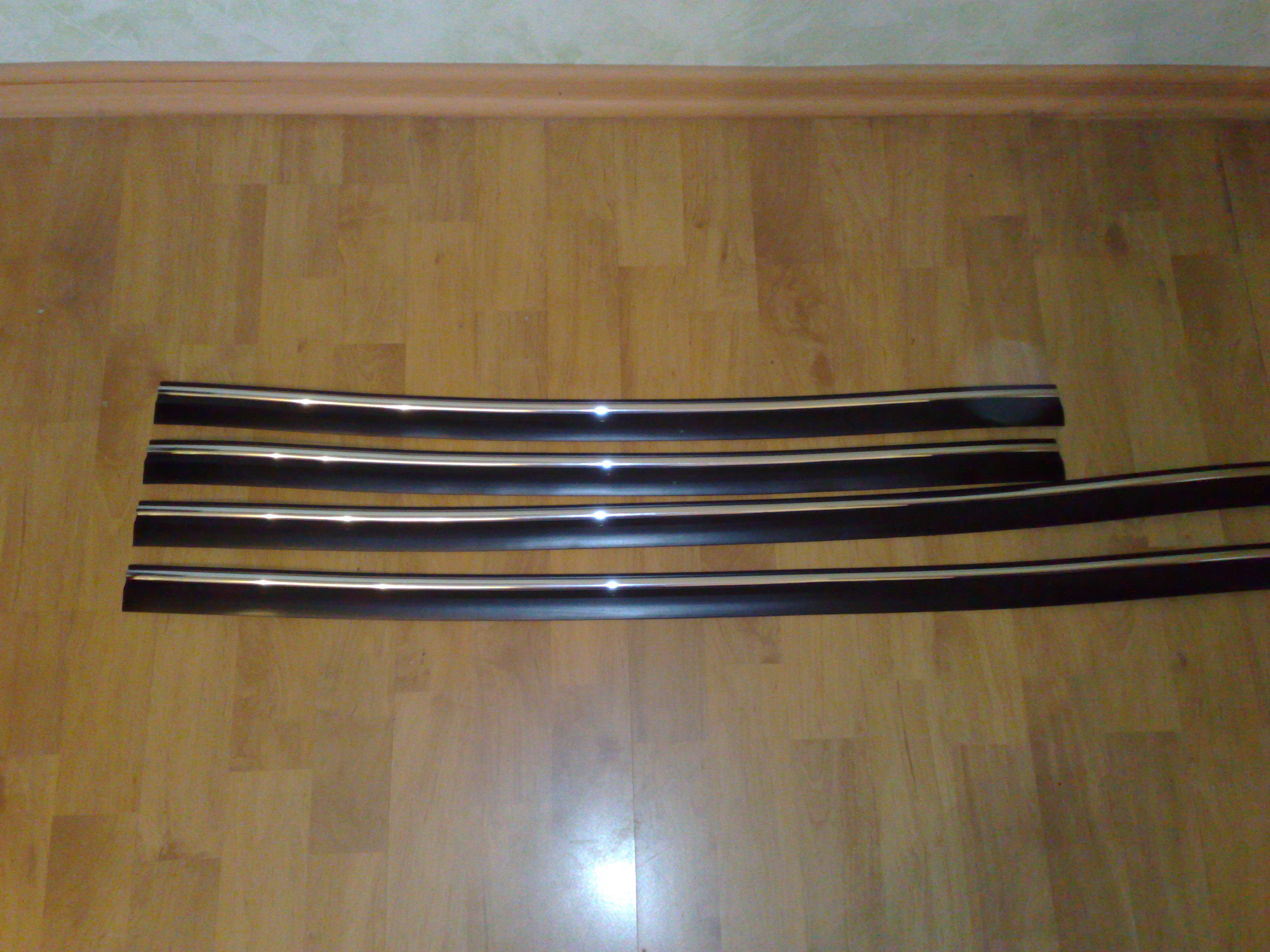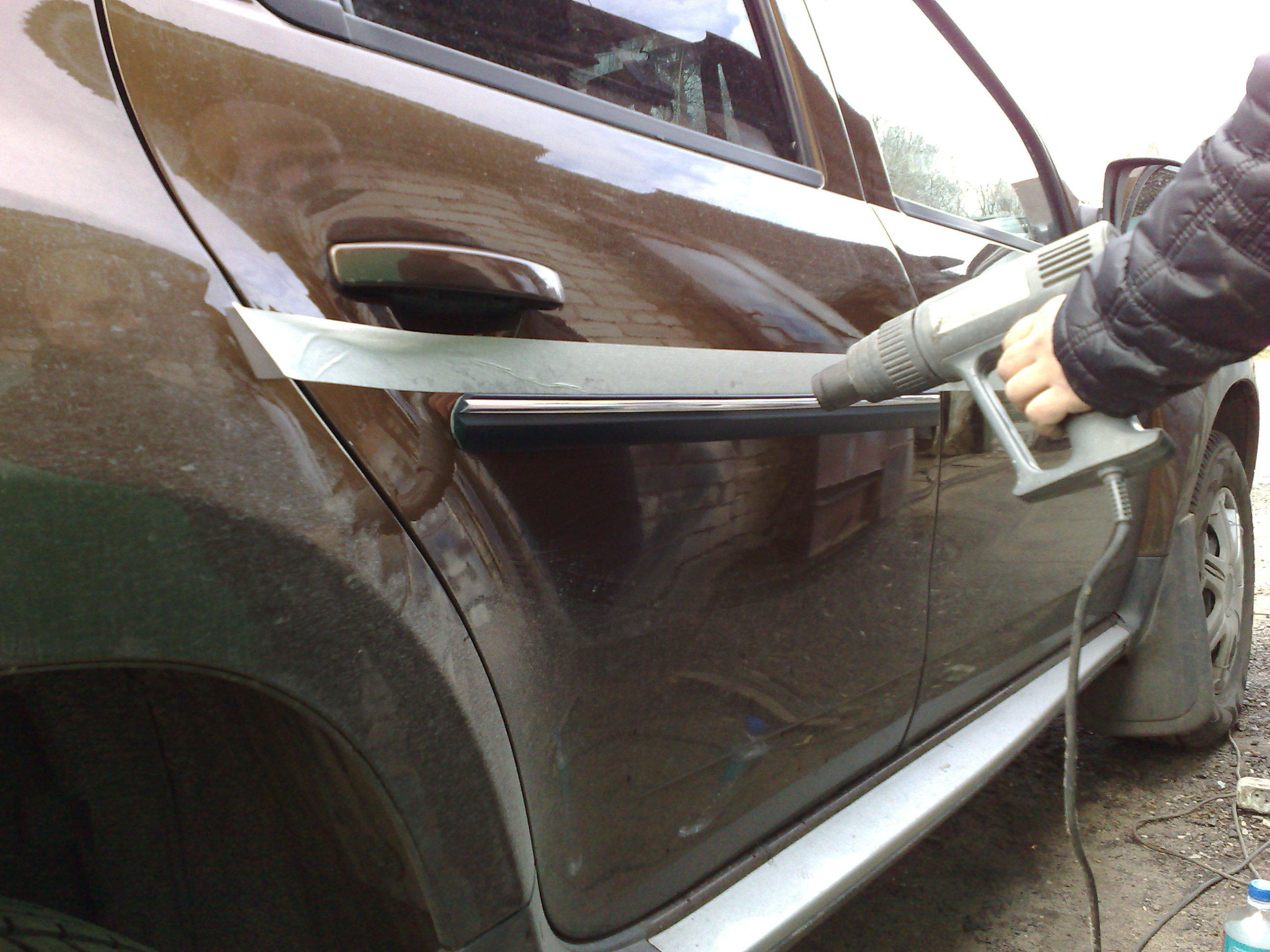 В прошлом году на стоянке, обнаружил на вод. двери след, от двери соседней машины. Вот и решил пришпандорить молдинг. Купил на метраж по 180р. и шир. 40мм. Выбор велик, остановился на этом. Нарезал, края зашлифовал полир. машинкой. По краям заменил родной скотч на ЗМ, чтобы было крепче, а самое главное , чтобы не затекала вода под молдинг.Дело было под осень, так что приклеивал используя фен. Как направляющую, использовал скотч.
