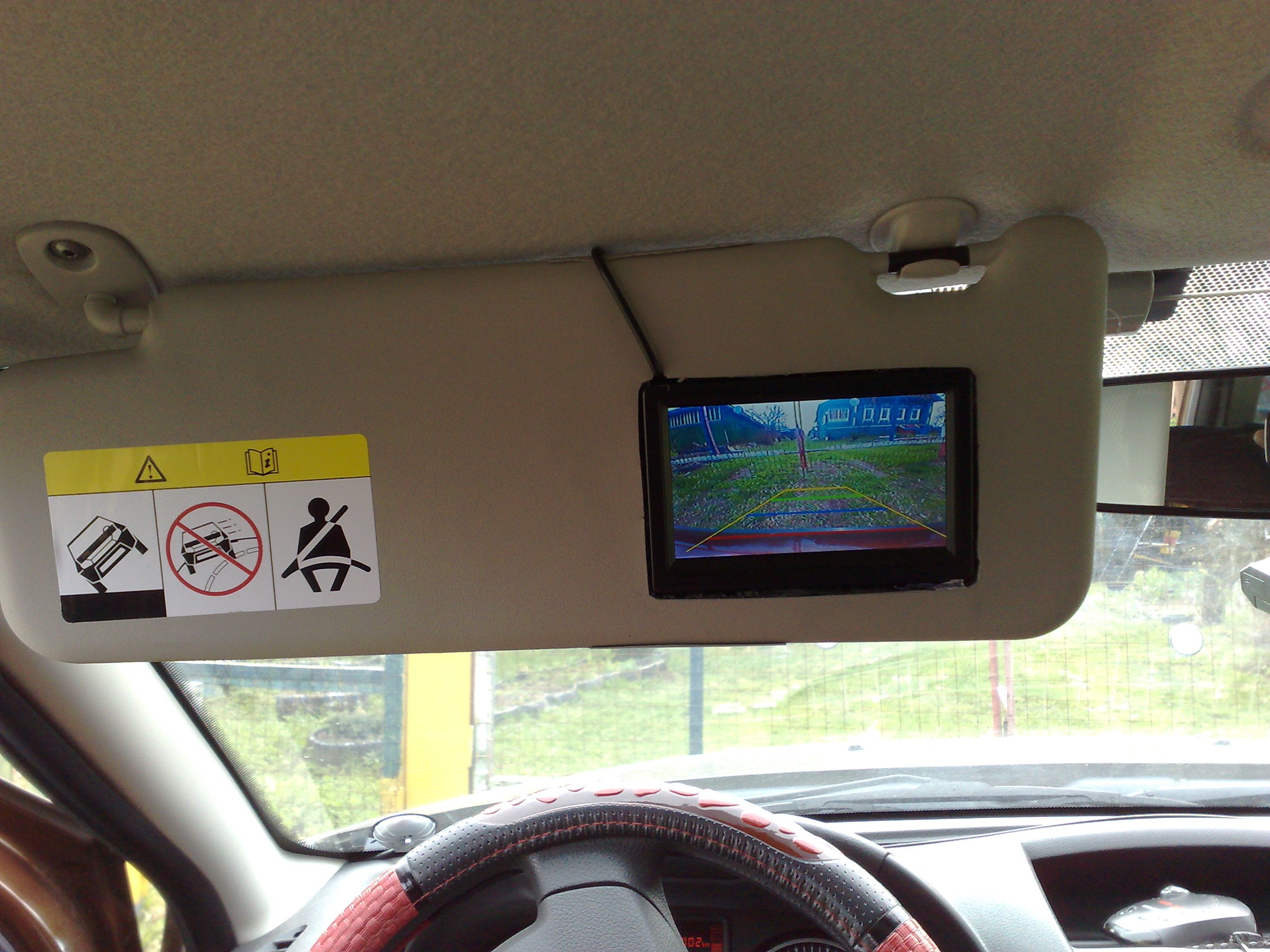 Привет Дмитрий! Вот все фото , как делал. Монитор складной на 2 видеовхода , у меня перед. и задн. камеры, диагональ вроде 4,2. Я сейчас езжу в очках, для меня конечно в козырьке очень близко.На панели было лучше, но только по зрению. Это единственный минус лично для меня. Когда едешь задом ,нормально,ведь задняя езда кратковременна , да и не всегда опускаю козырек,только когда есть риск или сомнения ,сзади. Монитор у потолка думаю будет не удобен,т.к. придется не только поднимать глаза на монитор , но и голову, одновременно смотреть в боковые зеркала и заднего вида. Перед тем, чтобыустановить постоянно, закрепите временно и попробуйте. Нравится,оставьте,крепите на постоянку. Каждому свое.