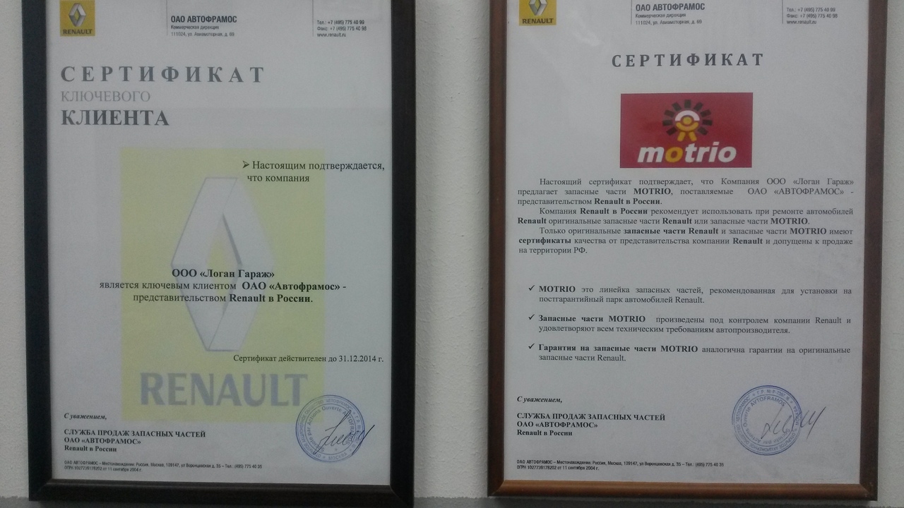 Качество оригинальных запасных частей подтверждено сертификатами от АВТОФРАМОСА.