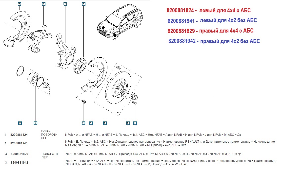 Двигатель, навесные агрегаты, трансмиссия: Бензонасос 1,6 – 172024388R Бензонасос 2,0 – 172025090R Вал карданный – 370002820R Водяной насос для 2,0 – 7701479043 Воздуховод/дефлектор радиатора правый – 214949303R Воздуховод/дефлектор радиатора левый – 214998574R Датчик абсолютного давления в коллекторе МАП-сенсор на двиг 2,0 и 1,6 – 8200719629 Датчик кислорода верхний – Bosch 0258986507 подходит и на верх и на низ Датчик массового расхода воздуха 1,5 dCi – 8200651315 Датчик положения коленвала 1,5 dCi – 8200885209 Датчик положения коленвала 2,0 – 8200746509 Датчик температуры ОЖ 2,0 – 226306024R Декоративная крышка двигателя 1,6 4x2 – 8200037825 Декоративная крышка двигателя 1,6 4x4 – 8200037823 Декоративная крышка двигателя 2,0 – 8200080989 Двигатель 2,0 в сборе – 8201219503 Ф1 Дроссельная заслонка 2,0 – 8200123061 Катушка зажигания – 8200568671 Корпус воздушного фильтра - 8200420871 Ф1 Комплект ГРМ Renault Duster 2,0 – 130C16514R КПП TL8 в сборе – 8201280175 Насос масляный для F4R -15 01 005 65R Педаль газа – 6001548477 Подшипник выжимной сцепления (муфта гидравлическая) 1,5 dCi – Valeo 804544, 306202899R Подшипник выжимной сцепления (муфта гидравлическая) 1.6 K4M / 2,0 Duster 306204287R Подшипник выжимной сцепления (муфта гидравлическая) 1.6 K4M / 2,0 Duster Valeo 804587 Подшипник выжимной сцепления (муфта гидравлическая) 1,6 4х2 - 8200148787 Пробка поддона ДВС 1,5dСi – 7703075348 Пробки зад.редуктора 4*4: - Сливная – 32103-1MG0A - Заливная – 32103-1MG0B Прокладка дроссельной заслонки – 8200068566 Прокладка крышки маслозаливной горловины 2,0 – 7701051797 Прокладка сливной пробки КПП, раздатки – 7703062062 Прокладка сливной пробки редуктора заднего моста – 110264N200 Прокладка впускного коллектора передняя – 8200052312 - нужно 4 шт Прокладка впускного коллектора задняя – 8200052311 - нужно 1 шт Прокладка сливной пробки поддона двигателя – 110265505R Прокладка клапана фазорегулятора двигателя 2,0 – 7700106385 она же Corteco 20030493B Ремень генератора+ролик натяжителя, комплект 2,0 с кондиционером – 117209732R Сальник коленвала 2,0 передний – 7700103245 Сальник коленвала 2,0 ЗАДНИЙ - 122797403R Сальники распредвала 2,0 (комплект) – 7701477180 Свеча зажигания одноконтактная – 7700500155 Свеча зажигания двухконтактная – 7700500168 Стартер - 8200665520 Сцепление, комплект (корзина и диск) 1,5 dCi – 7701479161, SACHS 3000950629 Сцепление, комплект (корзина и диск ) 1.6 4х4 –7701479126 Сцепление, комплект (корзина и диск ) 1.6 4х2 –302050901R Сцепление без выжимного 2,0 – 302059157R Термостат 1,6 и 2,0 – 8200772985 Ф1 Термостат 1,5 dci открытие 89` --- Sasic 4000384 Термостат 1,5 dci открытие 83` --- 8200 954 288 Фиксатор патрубка воздухозаборника - 7700108056 Фильтр воздушный двигателя 1,6, 2,0 – 8200431051 Фильтр воздушный двигателя 1,5 dСi – 8200985420 Фильтр масляный 1,5 dCi – 8200768927 Фильтр масляный 1,6 – 7700274177 Фильтр масляный 2,0 – 8200768913 Подвеска, тормоза, рулевое управление: Амортизатор задний 4х4 – 8200811407 Амортизатор передний 4х4 – 543028126R Амортизатор передний 4х2 АКПП 2,0 – 543025648R Амортизаторы нештатные: Амортизатор задний 4х4 BILSTEIN (B4 Gas) – 22-224583 Амортизатор задний 4х4 BILSTEIN (B6 SPORT) – 22-235053 Амортизатор передний 4х4 BILSTEIN (B4 Gas) – 22-223470 Амортизатор передний 4х4 BILSTEIN (B6 SPORT) – 22-235039 Амортизатор задний 4х2 BILSTEIN (B4 Gas) – 19-223483 Амортизатор передний 4х2 BILSTEIN (B4 Gas) – 22-223470 дает каталог BILSTEIN, получается что амортизаторы передние одинаковые Амортизатор задний 4х2 Kayaba – 343827 Втулка амортизатора переднего/заднего – 6001550754 Втулка стабилизатора поперечной устойчивости заднего – 562300111R , Hans Pries 701187586 Втулка стабилизатора поперечной устойчивости переднего – 8200852550 или 546114237R или Sasic 2304026 Диск колёсный (штатная черная запаска) – 403007958R Ф1/2 Диск колёсный сти