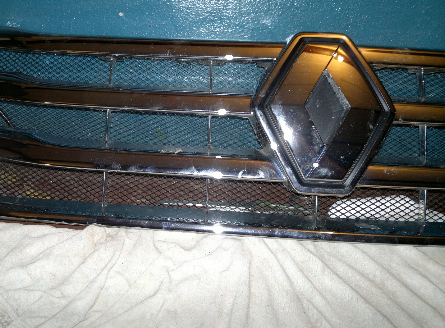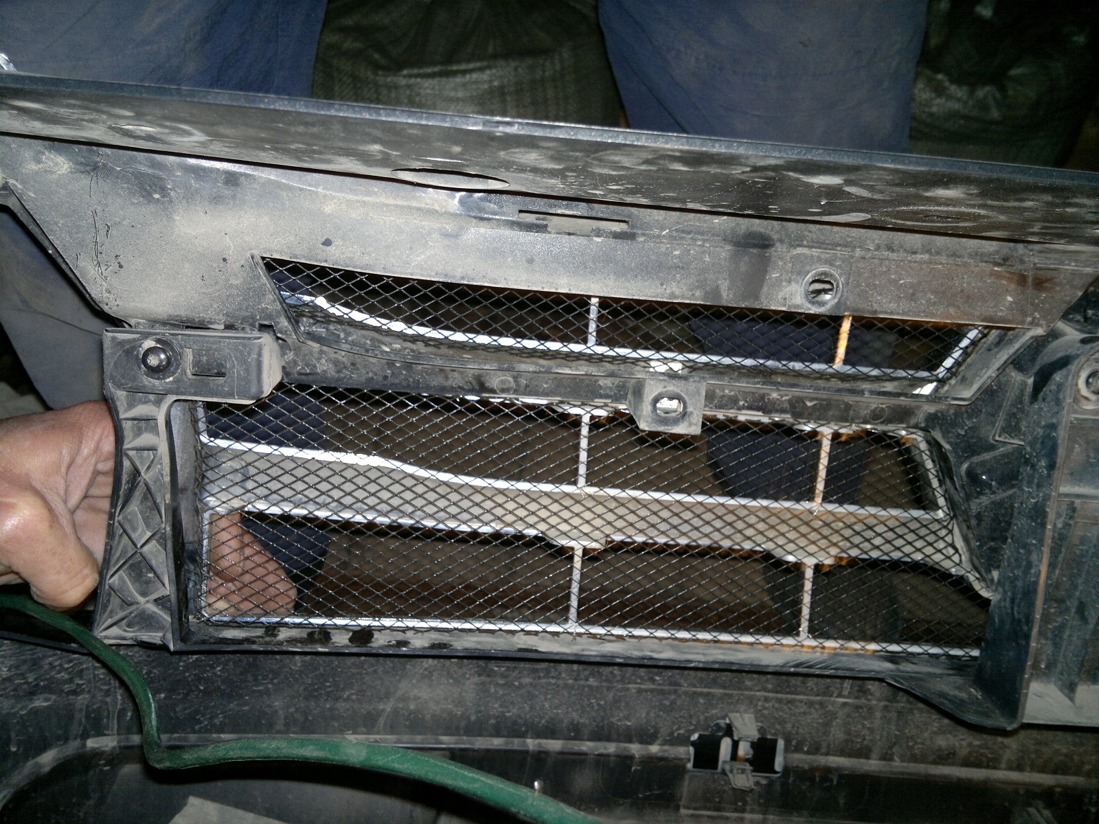 Сразу хочу сказать, хочешь сделать нормально - снимай бампер! Итак, приобретена сетка металлическая окрашенная в черный цвет на авторынке (на фото неокрашенная, ту что ставил забыл сфотографировать. Во всяком случае в Ульяновске в продаже трех видов: металлическая штампованная неокрашенная и окрашенная и полимерная). Снимаем бампер. Откручиваем винты крепления пластиковой накладки/защиты (все выкручивать не стоит, достаточно снять дальний ряд). Откручиваем нижнее крепление бампера. Откручиваем верхнее крепление бампера. Выворачиваем саморезы крепящие бампер и подкрылок Начинаем аккуратно снимать бампер. Приложив небольшие усилия снимаем бампер с фиксаторов/защелок (по три с каждой стороны) теперь бампер у нас в руках, точнее на полу (не забываем разъединить разъем ПТФ в левом крыле)... Приступаем к установке сетки. Убираем проводку (ПТФ и ДХО) из фиксаторов что бы не мешали. Снимаем "лопухи" с нижней решетки отщелкивая пластиковые фиксаторы. Снимаем усилитель бампера. И вот перед нами предстала нижняя решетка... по решетке кроить сетку не стал, сделал шаблон из картона. Наложил шаблон на сетку, обвел мелом и вырезал... Прикладываем сетку к решетке, подформовываем ее по форме с учетом фиксаторов. Крепил проволочками из нержавейки... Сгибал, подсовывал у ребра с лицевой стороны, а с внутренней скручивал и излишки обрезал (этот метод крепления проходил на моем Логане 4 года, у отца пошел 3 год эксплуатации, держится замечательно)... Нижняя часть готова. Приступаем к верхней. Для удобства снимаем ее открутив 7 внутренних саморезов Так как крепление верхней решетки хитрое, обшивать будем кусками... Метод крепления аналогичный и нижней сетке (все крепления осуществлял только на вертикальные ребра и вверху под пересечением с горизонтальным) В итоге получаем решеточку С обратной стороны в собранном виде, но без усилителя бампера А снаружи выглядим теперь так