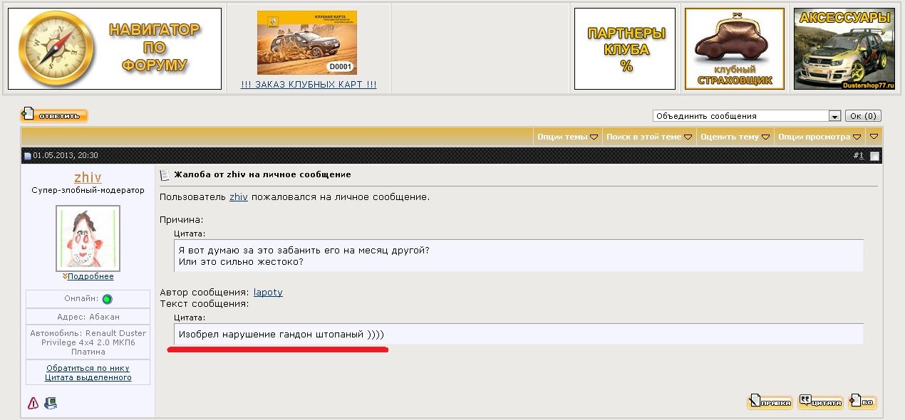 ---------- Сообщение добавлено в 22:40 ---------- Предыдущее сообщение размещено в 22:27 ---------- Ходатайствую он новом банане Zhiv, не успели разбанить его, а он уже первыми же сообщениями провоцирует здесь склоку.. ПэЦэ: В общем такие вот неуравновешенные модераторы беспредельничают на "альтернативных" форумах... и чем больше этот беспредел там, тем больше участников становится здесь, т.к тут таких пока слава Богу нет |