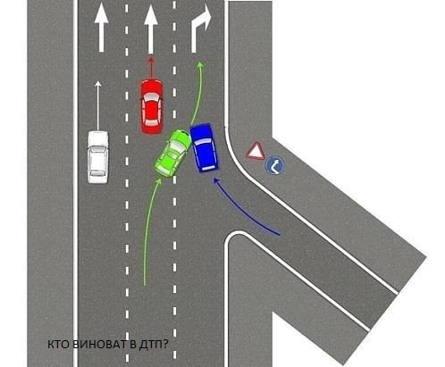 Я за синего, он уже выехал на полосу с прилегающей . т.е. просто едет по правой полосе, а зелёный перестраивается. Наверное вопрос и его возможные трактовки из-за того, на сколько близко/далеко от перекрестка это произошло. Кстати, частенько, непосредственно напротив такого перекрестка между правой и средней полосой нарисована сплошная.