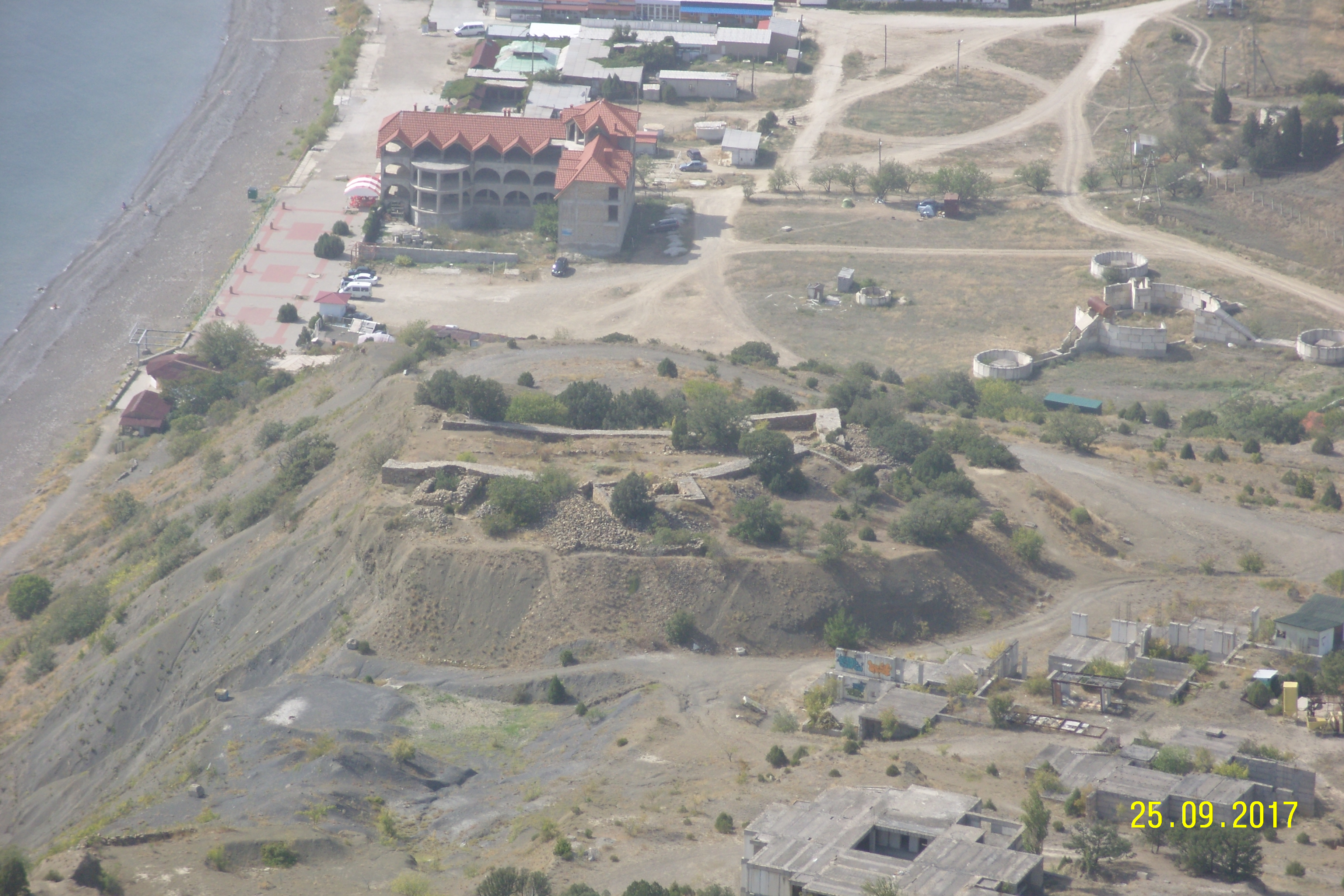 Фотки для общего представления. Много недостроя. Продуктовые магазинчики имеются. Эллинг на фото просматривается. Возле построек спуск к пляжу невысокий. В западной части пляжа - небольшой обрывчик. Там с палатками народ стоит. |