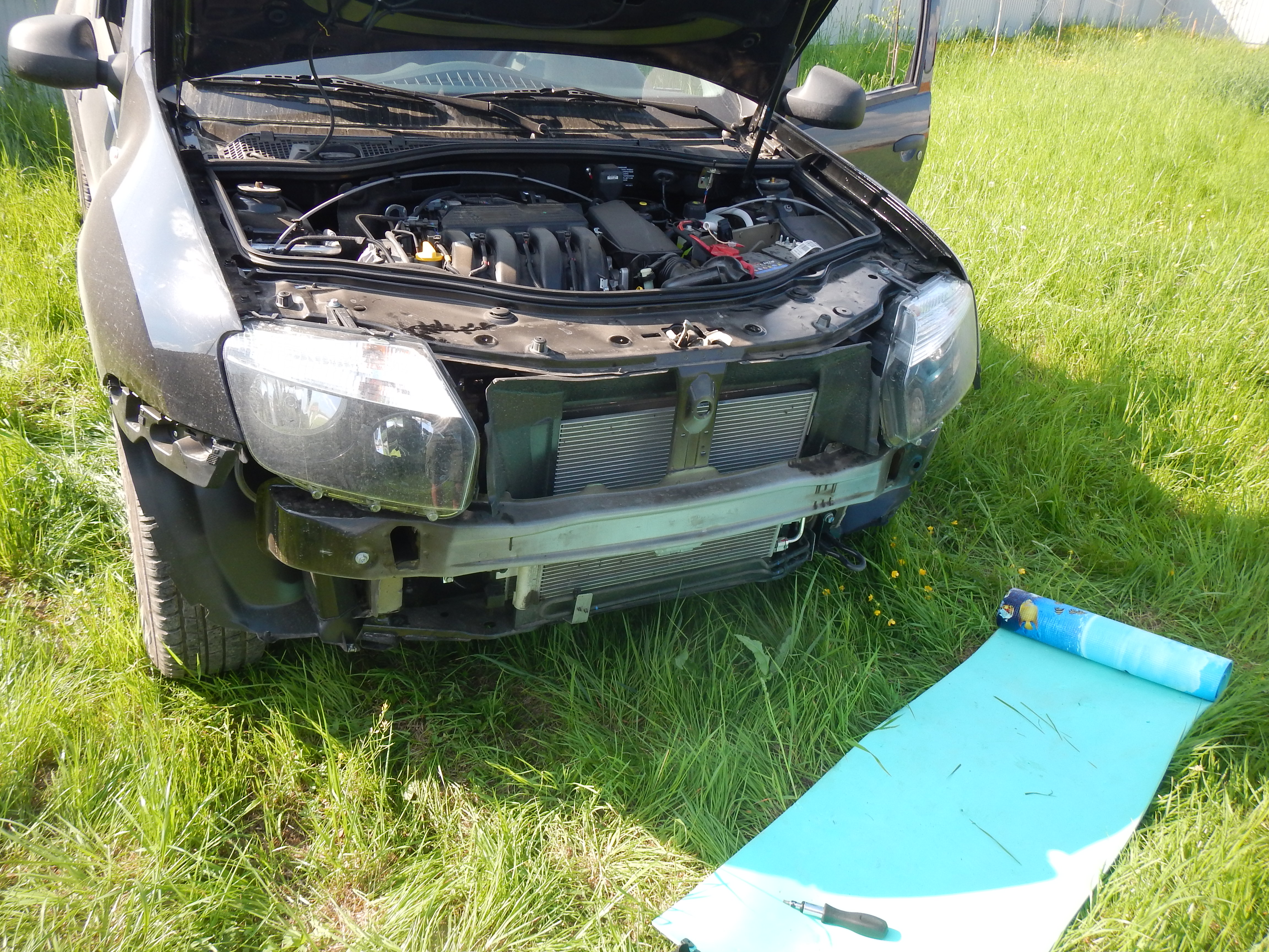 Решил поставить сновья, сейчас руки дошли. Цель - защитить радиаторы от возможного попадания камней, но что более важно, от попадания травы, листьев, пуха и проч, ведь за город все таки буду выезжать на дастере.