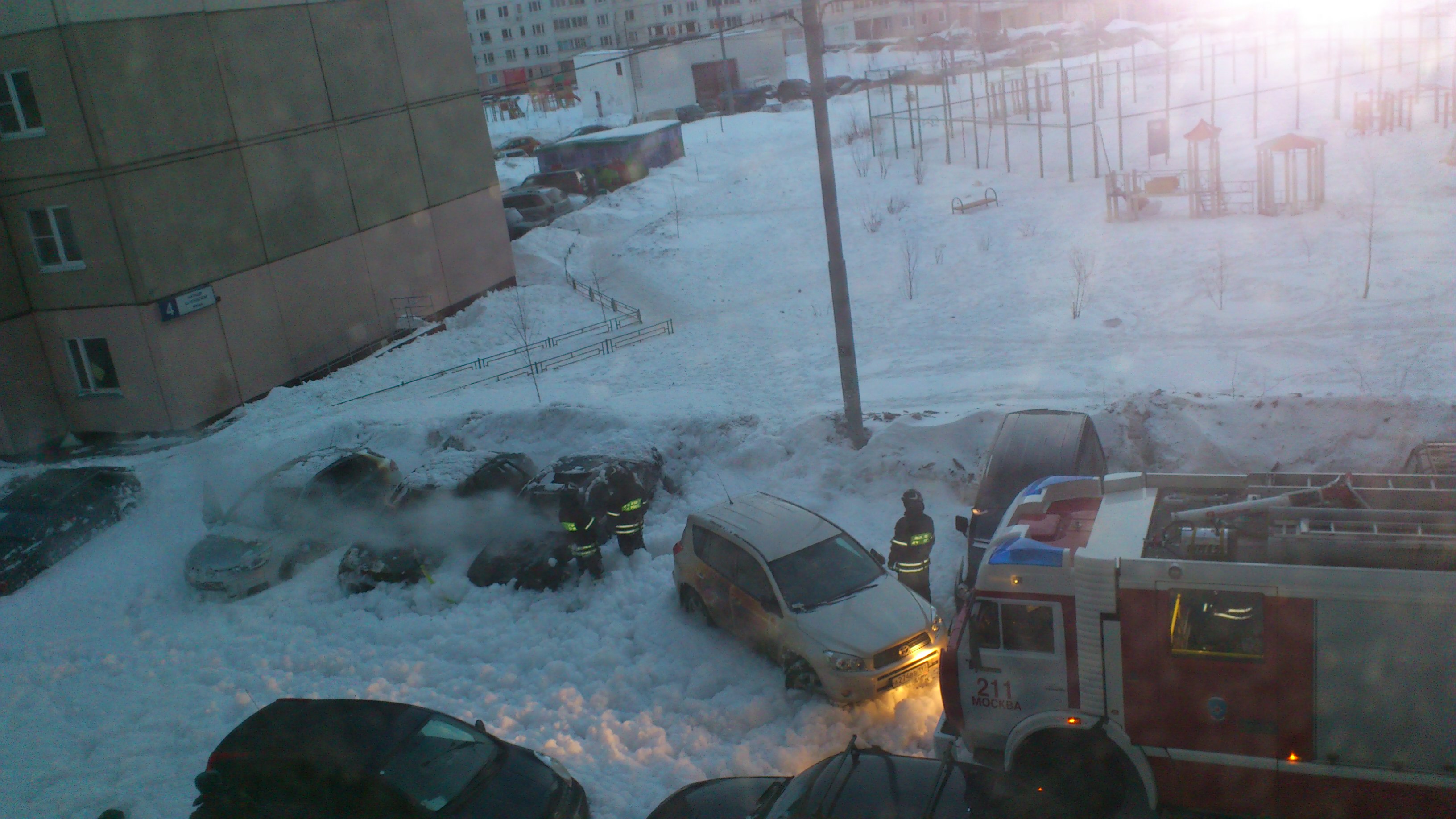 Это произошло в районе Кожухово (ВАО). Когда мы увидели и действительно подручными средствами мы бы ничего уже не сделали, даже автомобильными огнетушителями. Был очень сильный огонь. Мы пожалели, что у нас дома не было длинного шланга, чтобы подключиться к водопроводу и попробовать поливать машины водой хотя бы с балкона.