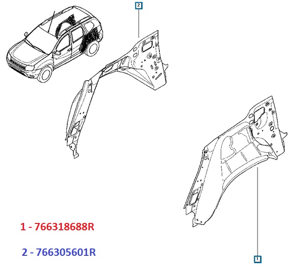 2. Если я правильно понял, речь о внутренней арке крыла - 766318688R ![]() 3. Пол багажника - 745145485R Думаю потребуются еще и боковины - усилитель пола багажника левый - 745337398R 4. 901001386R - дверь багажника 5. Порог двери багажника - 791026935R 6. Стекло заднее с обогревом - 903001494R 7. Правый кронштейн заднего бампера - 622200145R Левый кронштейн заднего бампера - 622214225R Усилитель заднего бампера - 850903196R 8. задний бампер под покраску без заднего радара - 850220171R 9. Глушитель 4х4 - 200101179R