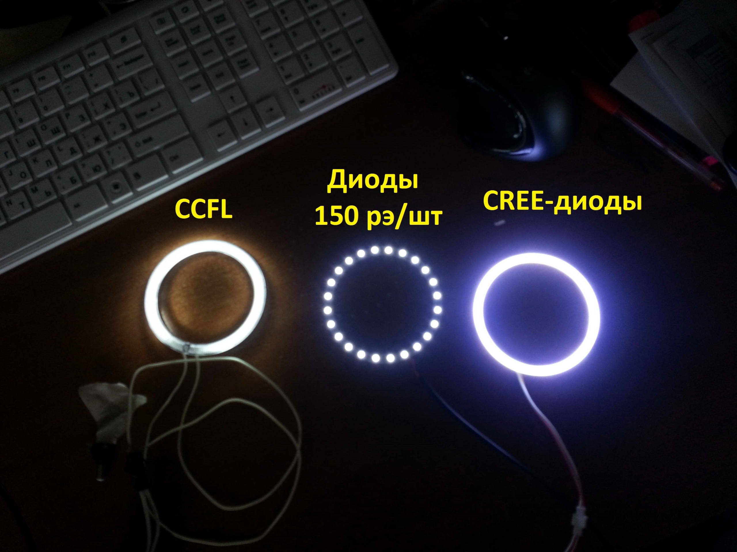 CCFL "геморны" со технической стороны тем, что являются довольно хрупкими (добрая встряска, и они уже не горят), капризными к погоде (в морозы теряют яркость), а так же являются зависимыми от своих блоков розжига (лишняя деталь-механизм в конструкции - больше шансов выхода из строя). А диодные "аналоги" разные бывают, может самые дешевые по 100 рублей за штуку с "Южного Порта" и не так ярко и ровно горят, но у меня на тестах светили куда интересней, чем CCFL, и уже я совсем молчу про качество и яркость диодных колец последнего поколения, которые я себе в итоге поставил...
