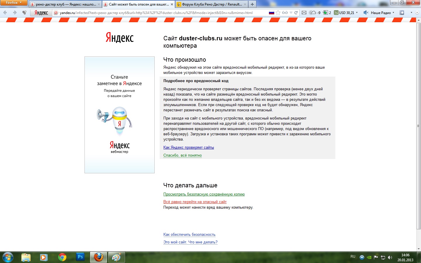 Не в тему но про Яндекс))): енто товарищ у меня ведёт себя как-то странно. Раз в два-три месяца, вдруг, перестаёт мне доверять, обзывает меня страшным словом СПАМЕР, и требует подтвердить что я не робот. Поэтому его закидоны я ваабще поначалу принял как норму. Ругается, ди хай с ним!!! И продолжает ругаться. А мне по барабану. Антивирус на компе молчит, значит енто болезнь Яндекса, надоест мне - уберу его и всё. Выбор есть.